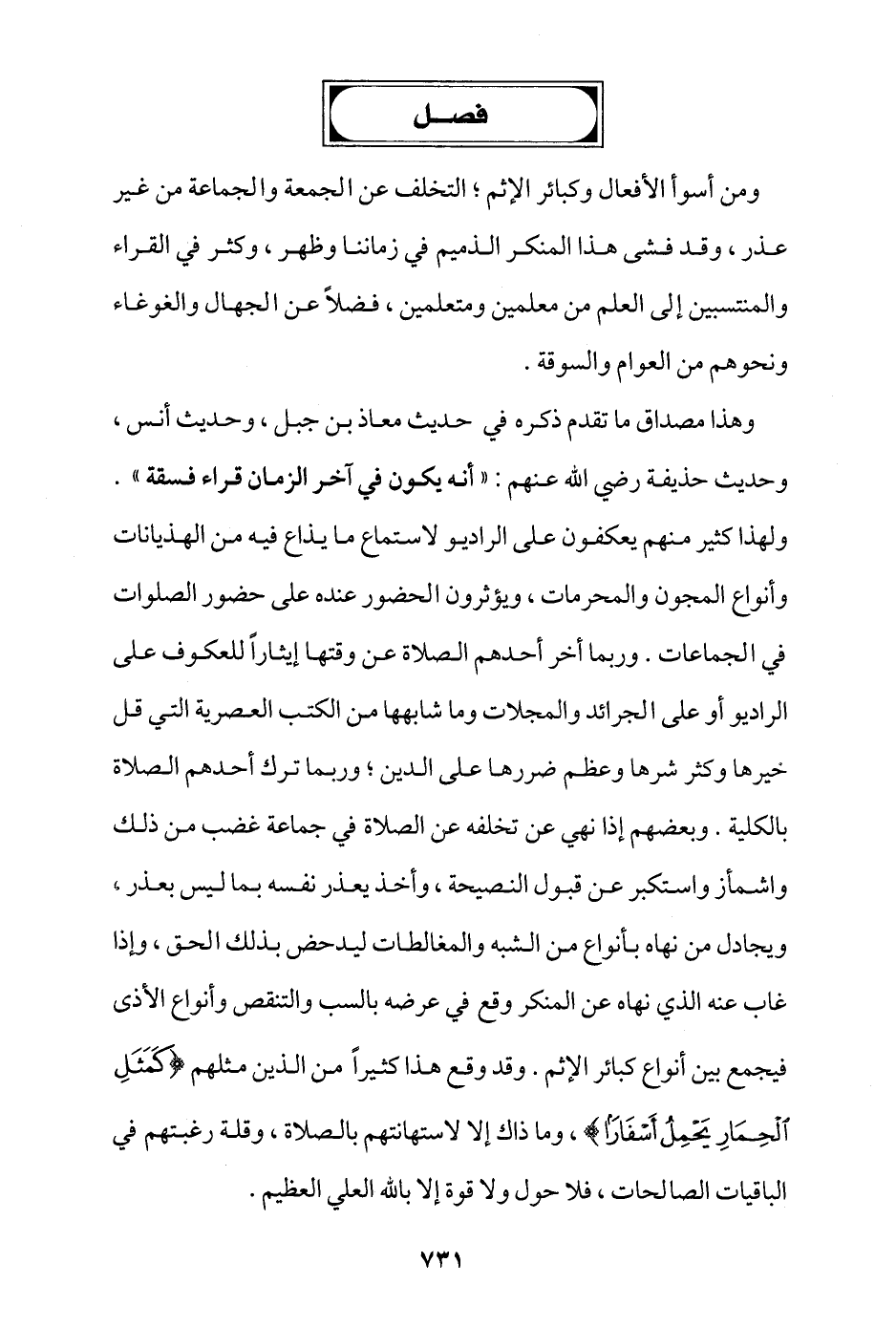 وهذا مصداق ما تقدم ذكره في حديث معاذ بن جبل، وحديث أنس، وحديث حذيفة -رضي الله عنهم-: «أنه يكون في آخر الزمان قراء فسقة»، ولهذا كثير منهم يعكفون على الراديو لاستماع ما يذاع فيه من الهذيانات وأنواع المجنون والمحرمات، ويؤْثِرون الحضور عنده على حضور الصلوات في الجماعات، وربما أخَّر أحدهم الصلاة عن وقتها إيثارًا للعكوف على الراديو أو على الجرائد والمجلات وما شابهها من الكتب العصرية التي قل خيرها وكثر شرها وعظم ضررها على الدين، وربما ترك أحدهم الصلاة بالكلية، وبعضهم إذا نُهي عن تخلفه عن الصلاة في جماعة غضب من ذلك واشمأز واستكبر عن قبول النصيحة، وأخذ يعذر نفسه بما ليس بعذر، ويجادل من نهاه عن المنكر ويقع في عرضه بالسب والتنقص وأنواع الأذى، فيجمع بين أنواع كبائر الإثم، وقد وقع هذا كثيرًا من الذين مَثَلهم {كَمَثَلِ الْحِمَارِ يَحْمِلُ أَسْفَارًا}؛ وما ذاك إلا لاستهانتهم بالصلاة، وقلة رغبتهم في الباقيات الصالحات، فلا حول ولا قوة إلا بالله العلي العظيم.