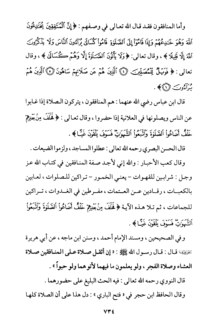 وأما المنافقون فقد قال الله تعالى في وصفهم: {إِنَّ الْمُنَافِقِينَ يُخَادِعُونَ اللَّهَ وَهُوَ خَادِعُهُمْ وَإِذَا قَامُوا إِلَى الصَّلَاةِ قَامُوا كُسَالَى يُرَاءُونَ النَّاسَ وَلَا يَذْكُرُونَ اللَّهَ إِلَّا قَلِيلًا}، وقال تعالى: {وَلَا يَاتُونَ الصَّلَاةَ إِلَّا وَهُمْ كُسَالَى}، وقال تعالى: {فَوَيْلٌ لِلْمُصَلِّينَ * الَّذِينَ هُمْ عَنْ صَلَاتِهِمْ سَاهُونَ * الَّذِينَ هُمْ يُرَاءُونَ}.