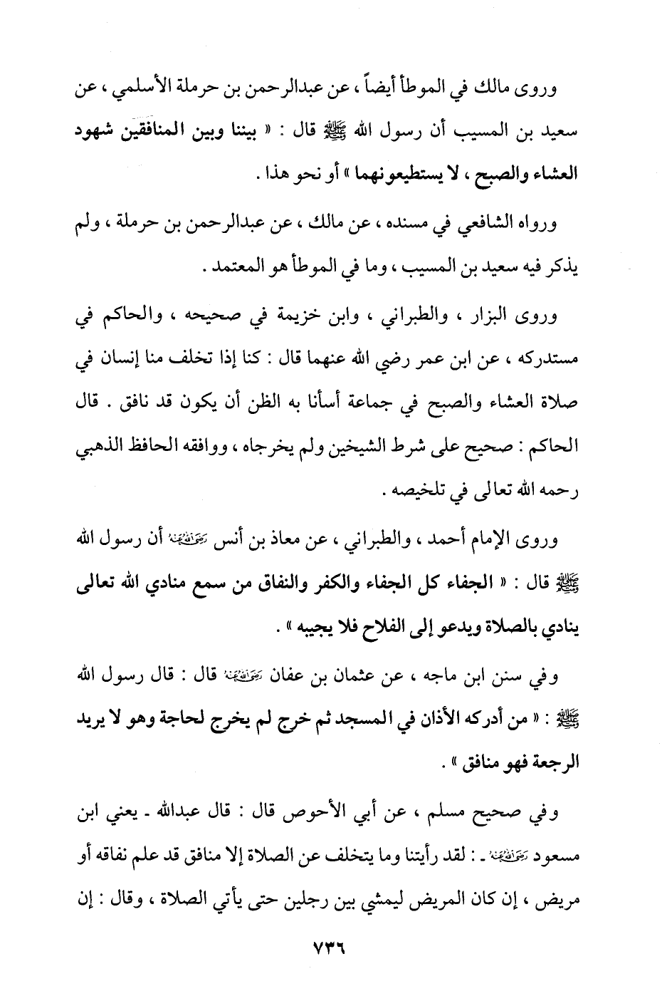 وروى مالك في الموطأ أيضًا، عن عبد الرحمن بن حرملة الأسلمي، عن سعيد بن المسيب أن رسول الله - صلى الله عليه وسلم - قال: «بيننا وبين المنافقين شهود العشاء والصبح، لا يستطيعونهما» أو نحو هذا.