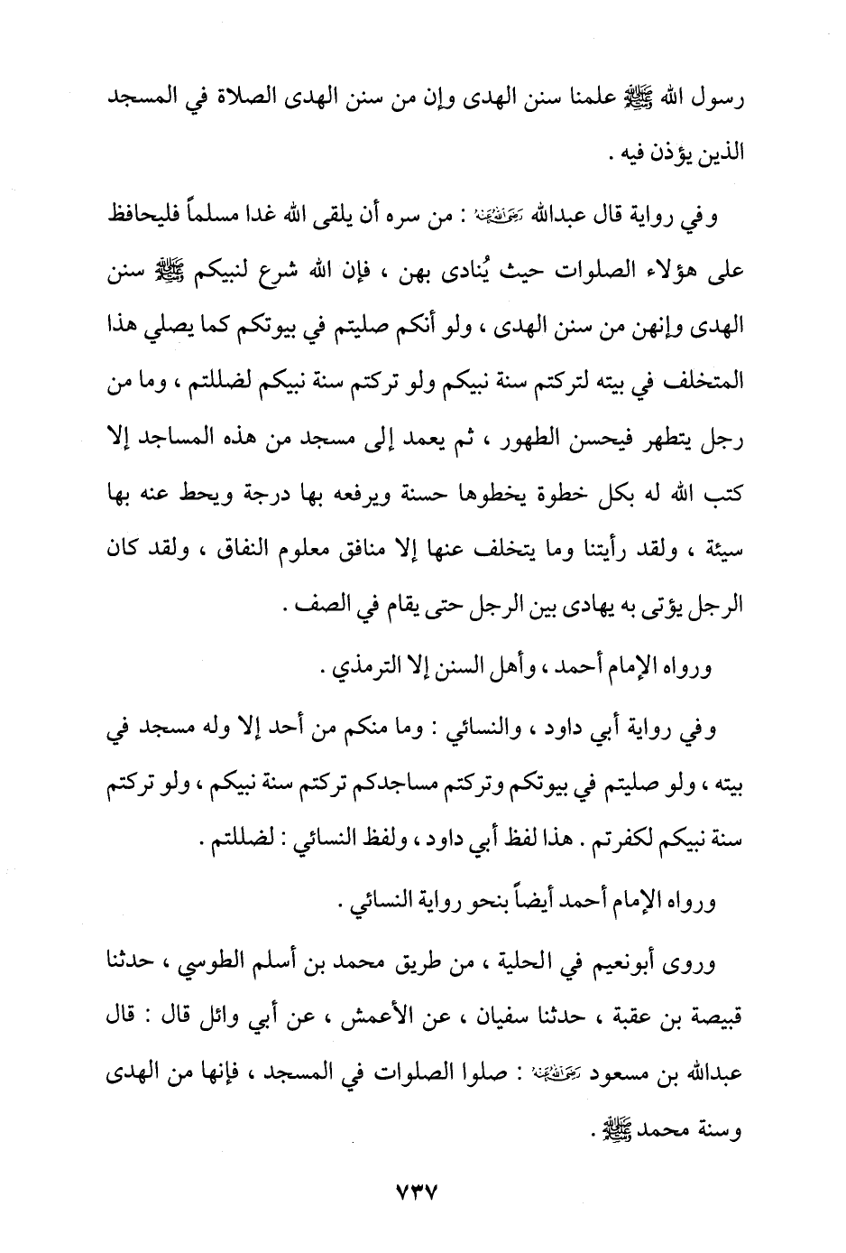 وروي أبو نعيم في الحلية، من طريق محمد بن أسلم الطوسي، حدثنا قبيصة بن عقبة، حدثنا سفيان، عن الأعمش، عن أبي وائل قال: قال عبد الله بن مسعود - رضي الله عنه -: صلوا الصلوات في المسجد، فإنها من الهدى وسُنة محمد - صلى الله عليه وسلم -.
