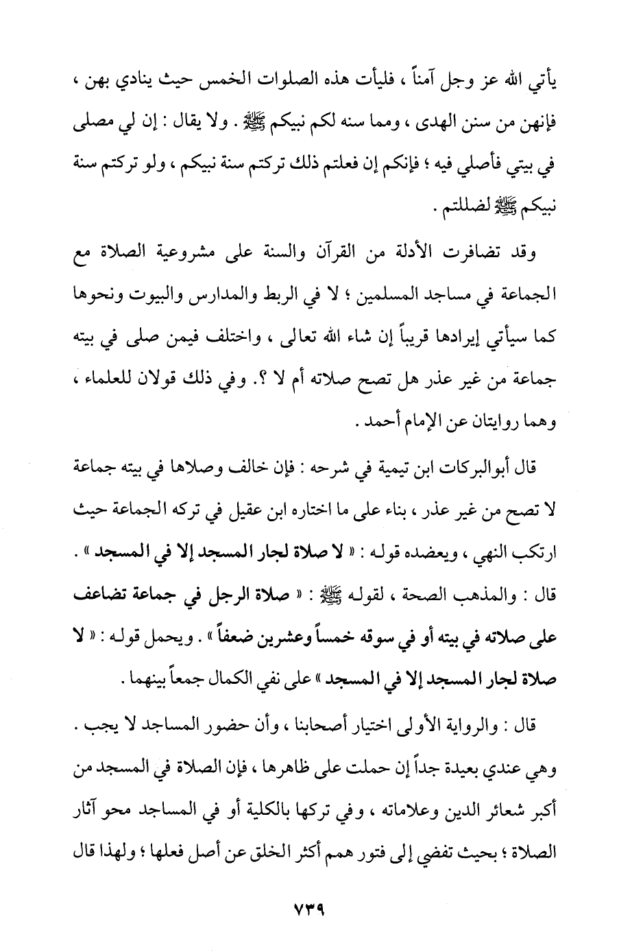 قال: والرواية الأولى اختيار أصحابنا، وأن حضور المساجد لا يجب، وهي عندي بعيدة جدًا إن حملت على ظاهرها، فإن الصلاة في المسجد من أكبر شعائر الدين وعلاماته، وفي تركها بالكلية أو في المساجد محو آثار الصلاة، بحيث تفضي إلى فتور همم أكثر الخلق عن أصل فعلها، ولهذا قال