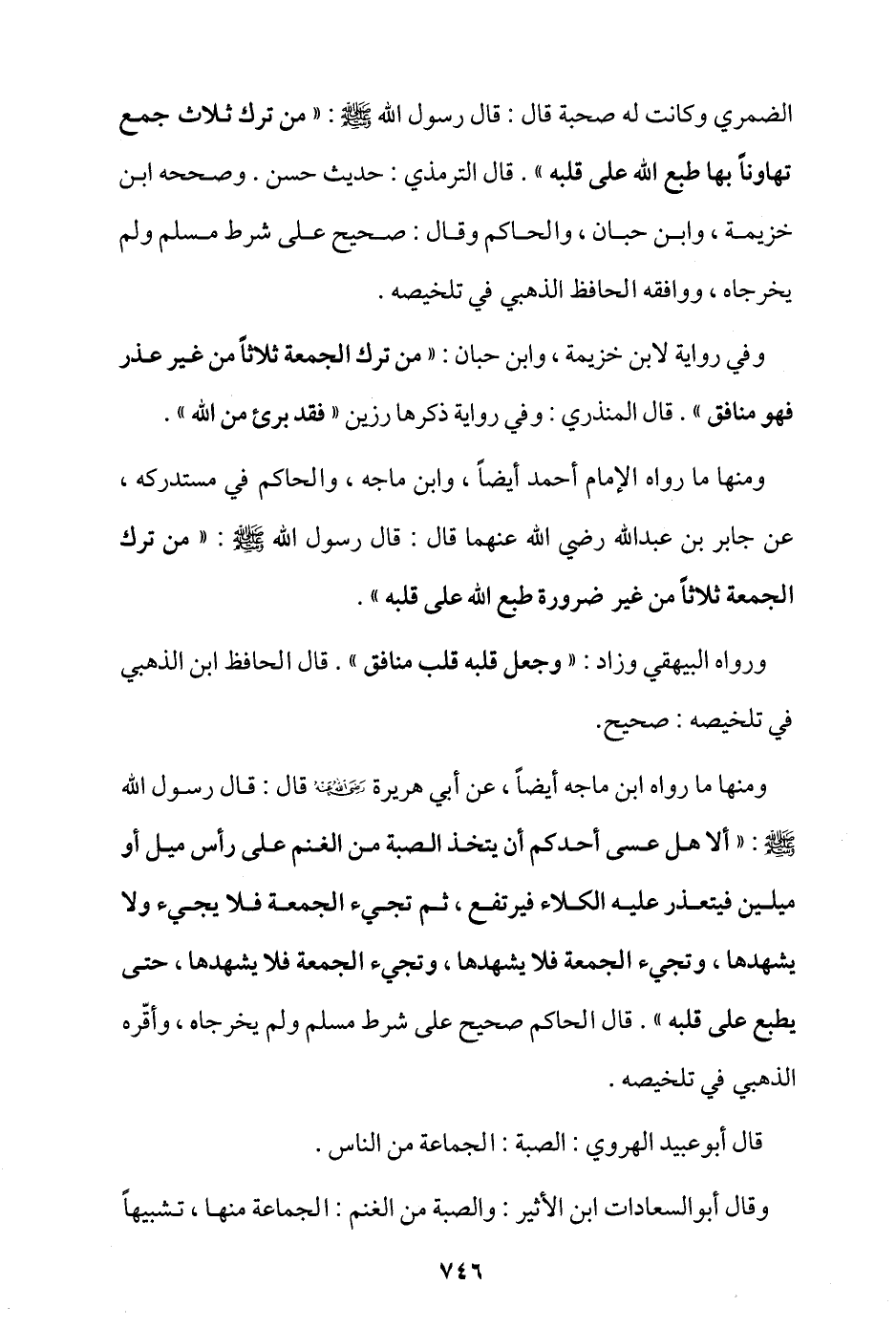 ومنها ما رواه ابن ماجه أيضًا، عن أبي هريرة - رضي الله عنه - قال: قال رسول الله - صلى الله عليه وسلم -: «ألا هل عسى أحدكم أن يتخذ الصبة من الغنم على رأس ميل أو ميلين فيتعذر عليه الكلاء فيرتفع، ثم تجيء الجمعة فلا يجيء ولا يشهدها، وتجيء الجمعة فلا يشهدها، وتجيء الجمعة فلا يشهدها، حتى يطبع على قلبه» قال الحاكم: صحيح على شرط مسلم ولم يخرجاه، وأقره الذهبي في تلخيصه.