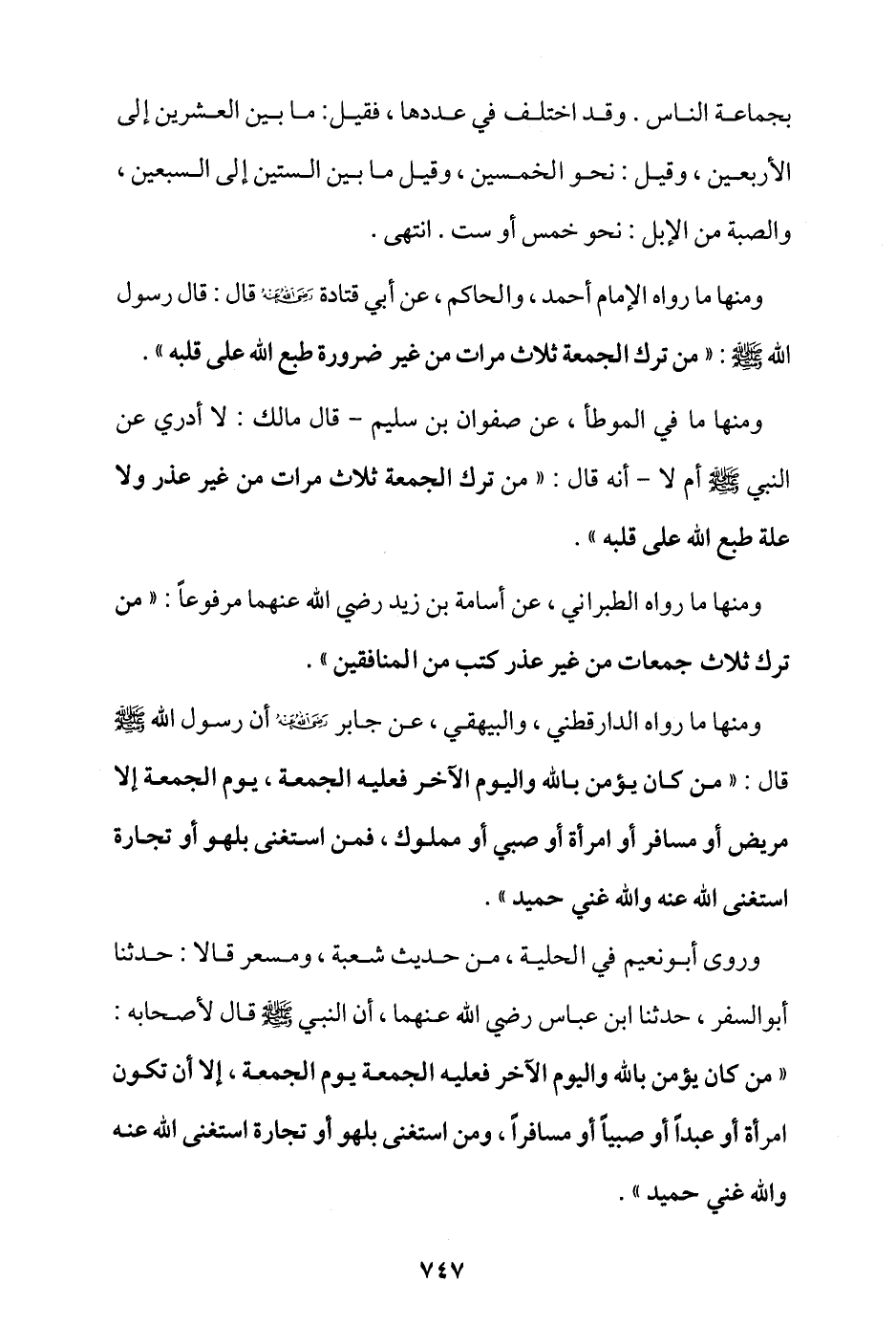 ومنها ما رواه الدارقطني، والبيهقي، عن جابر - رضي الله عنه - أن رسول الله - صلى الله عليه وسلم - قال: «من كان يؤمن بالله واليوم الآخر فعليه الجمعة يوم الجمعة، إلا مريض أو مسافر أو امرأة أو صبي أو مملوك، فمن استغنى بلهو أو تجارة استغنى الله عنه، والله غني حميد».