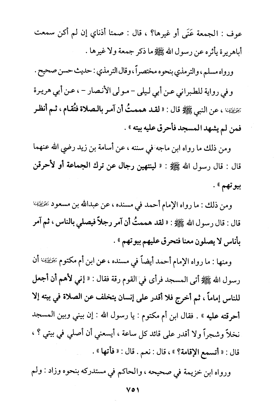 ومنها ما رواه الإمام أحمد أيضا في مسنده، عن ابن أم مكتوم - رضي الله عنه - أن رسول الله - صلى الله عليه وسلم - أتى المسجد فرأى في القوم رقة فقال: «إني لأهم أن أجعل للناس إمامًا، ثم أخرج فلا أقدر على إنسان يتخلف عن الصلاة في بيته إلا أحرقته عليه» فقال ابن أم مكتوم: يا رسول الله، إن بيني وبين المسجد نخلا وشجرًا ولا أقدر على قائد كل ساعة، أيسعني أن أصلي في بيتي؟ قال: «أتسمع الإقامة؟» قال: نعم، قال: «فأتها».