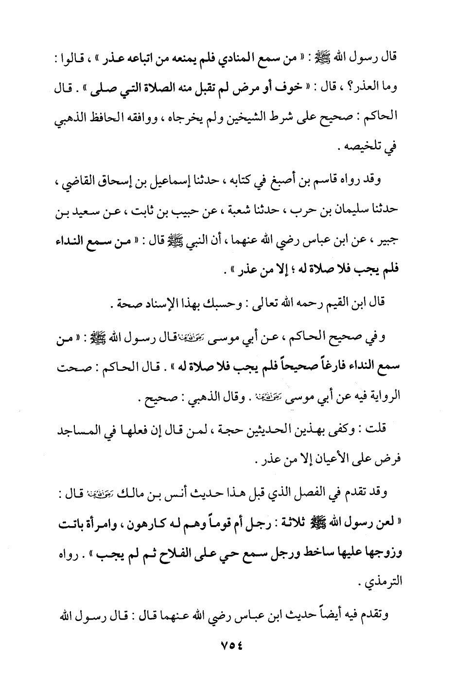 وقد رواه قاسم بن أصبغ في كتابه، حدثنا إسماعيل بن إسحاق القاضي، حدثنا سليمان بن حرب، حدثنا شعبة، عن حبيب بن ثابت، عن سعيد بن جبير، عن ابن عباس -رضي الله عنهما- أن النبي - صلى الله عليه وسلم - قال: «من سمع النداء فلم يجب فلا صلاة له إلا من عذر».