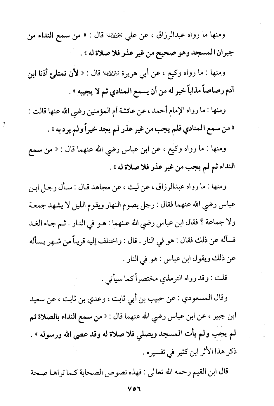 وقال المسعودي: عن حبيب بن أبي ثابت وعدي بن ثابت، عن سعيد بن جبير، عن ابن عباس -رضي الله عنهما- قال: «من سمع النداء بالصلاة ثم لم يجب ولم يأت المسجد ويصلي فلا صلاة له وقد عصى الله ورسوله» ذكر هذا الأثر ابن كثير في تفسيره.