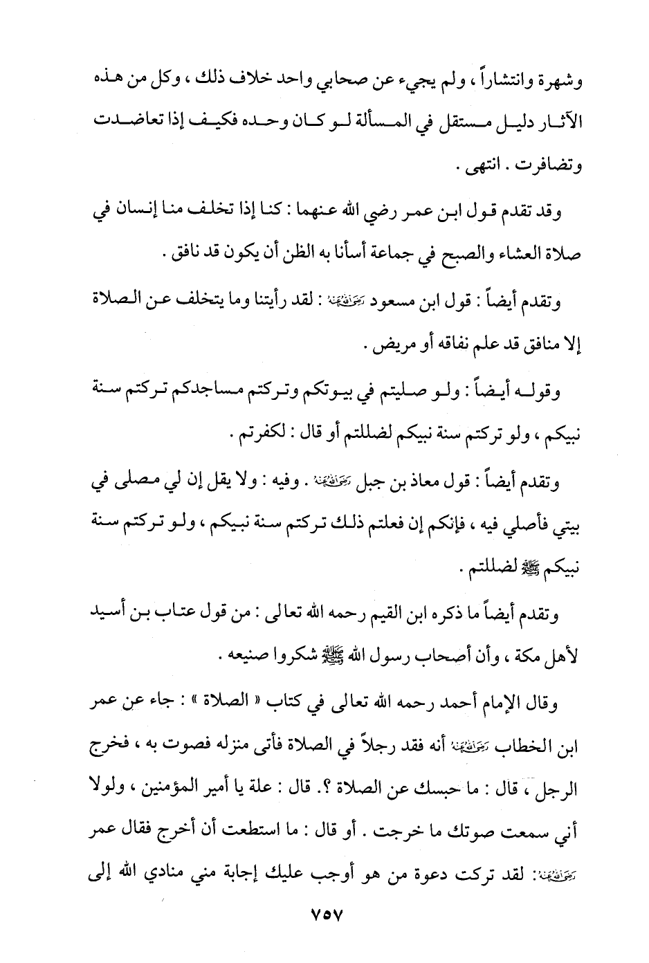 وتقدم أيضًا قول معاذ بن جبل - رضي الله عنه -، وفيه: ولا يقل إن لي مصلى في بيتي فأصلي فيه، فإنكم إن فعلتم ذلك تركتم سنة نبيكم، ولو تركتم سنة نبيكم - صلى الله عليه وسلم - لضللتم.