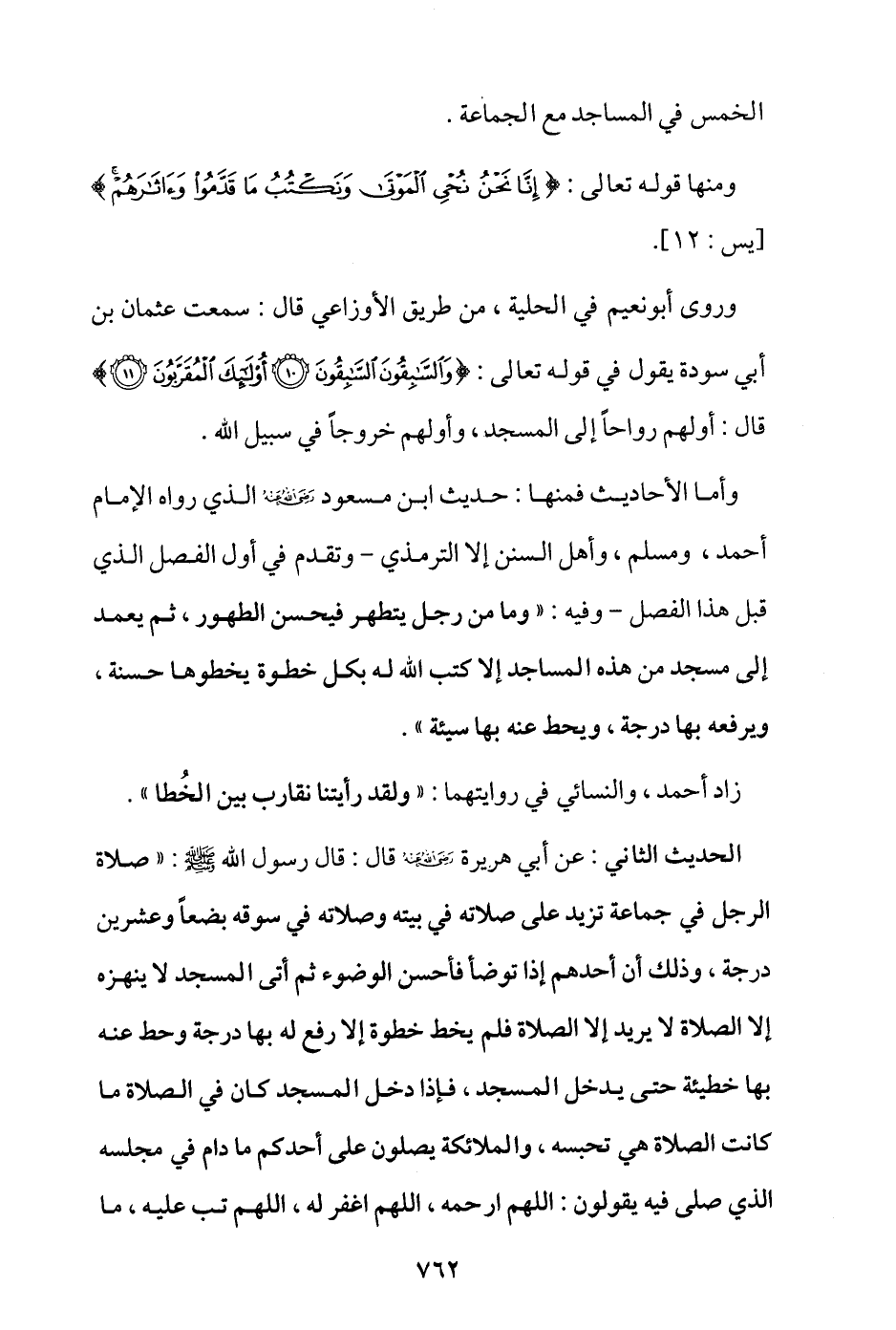 وأما الأحاديث، فمنها حديث ابن مسعود - رضي الله عنه - الذي رواه الإمام أحمد، ومسلم، وأهل السنن إلا الترمذي، وتقدم في أول الفصل الذي قبل هذا الفصل، وفيه: «وما من رجل يتطهر فيحسن الطهور، ثم يعمد إلى مسجد من هذه المساجد إلا كتب الله له بكل خطوة يخطوها حسنة، ويرفعه بها درجة، ويحط عنه بها سيئة».