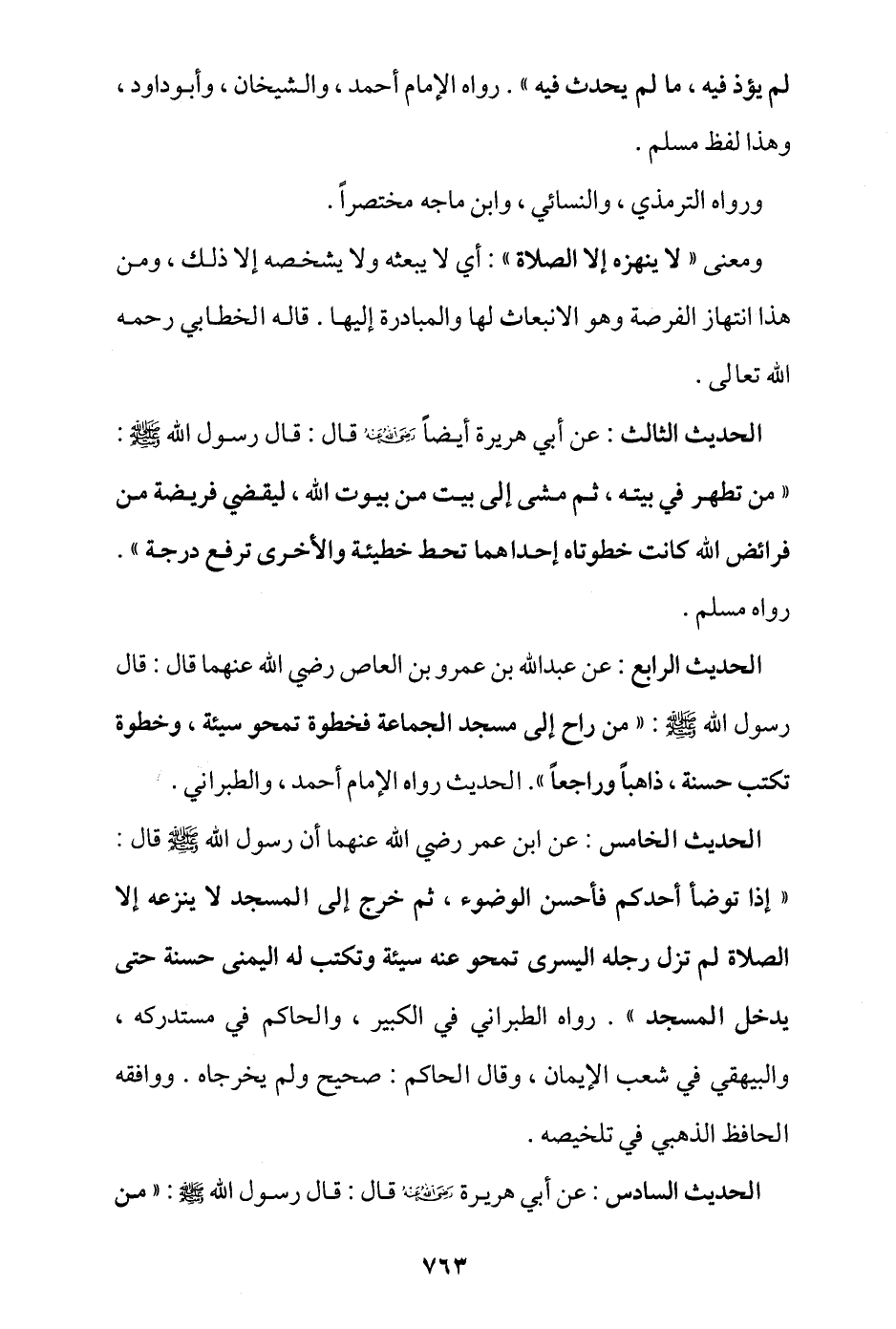 الحديث الخامس: عن ابن عمر -رضي الله عنهما- أن رسول الله - صلى الله عليه وسلم - قال: «إذا توضأ أحدكم فأحسن الوضوء، ثم خرج إلى المسجد لا ينزعه إلا الصلاة، لم تزل رجله اليسرى تمحو عنه سيئة وتكتب له اليمنى حسنة حتى يدخل المسجد» رواه الطبراني في الكبير، والحاكم في مستدركه، والبيهقي في شعب الإيمان، وقال الحاكم: صحيح ولم يخرجاه، ووافقه الحافظ الذهبي في تلخيصه.