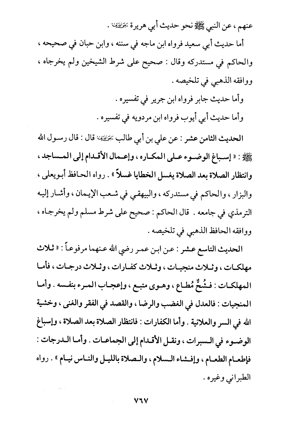 الحديث التاسع عشر: عن ابن عمر -رضي الله عنهما- مرفوعًا: «ثلاث مهلكات، وثلاث منجيات، وثلاث كفارات، وثلاث درجات؛ فأما المهلكات: فَشُحٌّ مطاع، وهوى مُتَّبع، وإعجاب المرء بنفسه، وأما المنجيات: فالعدل في الغضب والرضا، والقصد في الفقر والغنى، وخشية الله في السر والعلانية، وأما الكفارات: فانتظار الصلاة بعد الصلاة، وإسباغ الوضوء في السبرات، ونقل الأقدام إلى الجماعات، وأما الدرجات: فإطعام الطعام، وإفشاء السلام، والصلاة بالليل والناس نيام» رواه الطبراني وغيره.