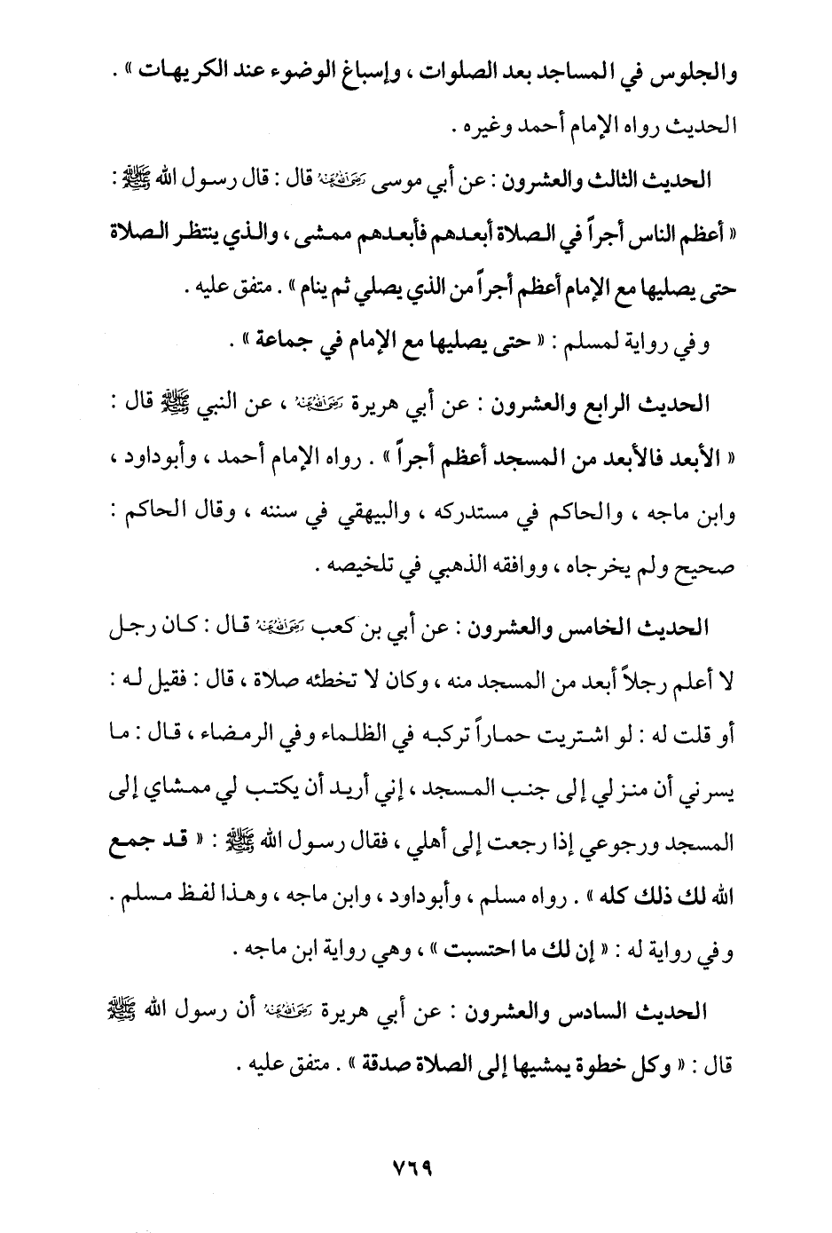 الحديث الرابع والعشرون: عن أبي هريرة - رضي الله عنه -، عن النبي - صلى الله عليه وسلم - قال: «الأبعد فالأبعد من المسجد أعظم أجرا» رواه الإمام أحمد، وأبو داود، وابن ماجة، والحاكم في مستدركه، والبيهقي في سننه، وقال الحاكم: صحيح ولم يخرجاه، ووافقه الذهبي في تلخيصه.