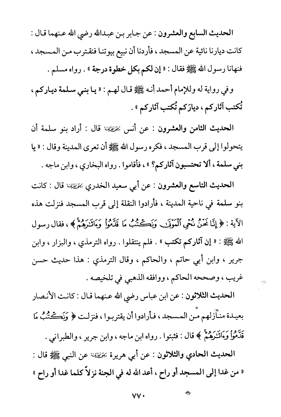 الحديث الثامن والعشرون: عن أنس - رضي الله عنه - قال: أراد بنو سلمة أن يتحولوا إلى قرب المسجد، فكره رسول الله - صلى الله عليه وسلم - أن تعرى المدينة وقال: «يا بني سلمة، ألا تحتسبون آثاركم» فأقاموا. رواه البخاري وابن ماجة.