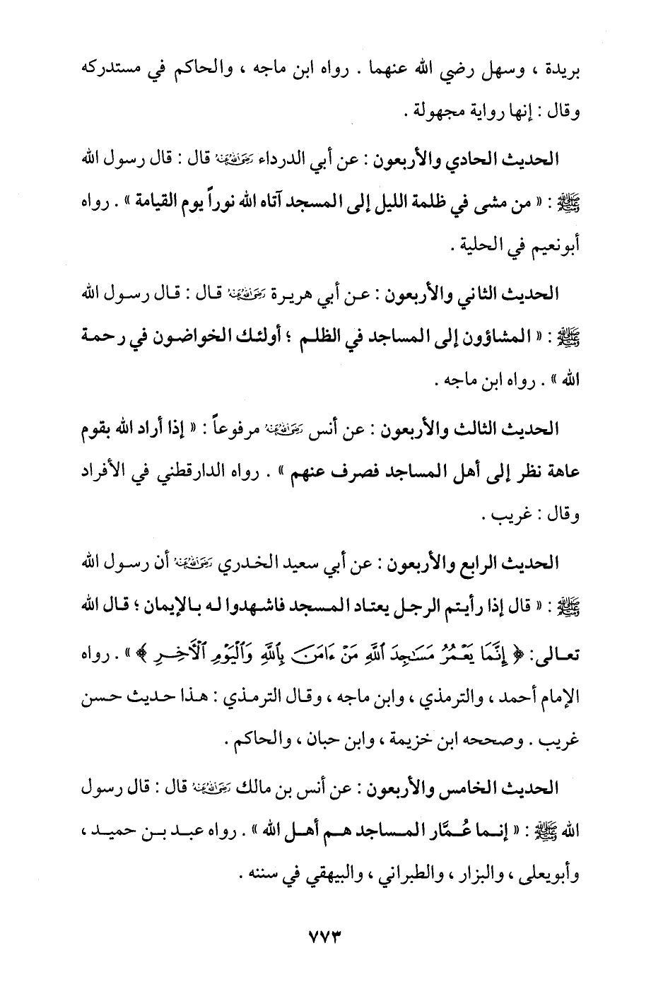 الحديث الرابع والأربعون: عن أبي سعيد الخدري - رضي الله عنه - أن رسول الله - صلى الله عليه وسلم - قال: «إذا رأيتم الرجل يعتاد المسجد فاشهدوا له بالإيمان؛ قال الله تعالى: {إِنَّمَا يَعْمُرُ مَسَاجِدَ اللَّهِ مَنْ آَمَنَ بِاللَّهِ وَالْيَوْمِ الْآَخِرِ}» رواه الإمام أحمد، والترمذي، وابن ماجة، وقال الترمذي: هذا حديث حسن غريب، وصححه ابن خزيمة، وابن حبان، والحاكم.