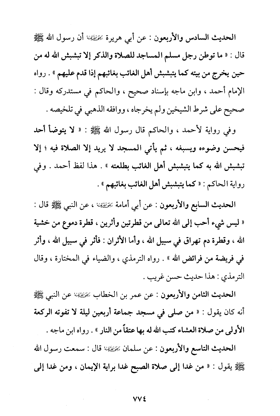 الحديث السادس والأربعون: عن أبي هريرة - رضي الله عنه - أن رسول الله - صلى الله عليه وسلم - قال: «ما توطن رجل مسلم المساجد للصلاة والذكر إلا تبشبش الله له من حين يخرج من بيته كما يتبشبش أهل الغائب بغائبهم إذا قدم عليهم» رواه الإمام أحمد، وابن ماجة بإسناد صحيح، والحاكم في مستدركه وقال: صحيح على شرط الشيخين ولم يخرجاه، ووافقه الذهبي في تلخيصه.