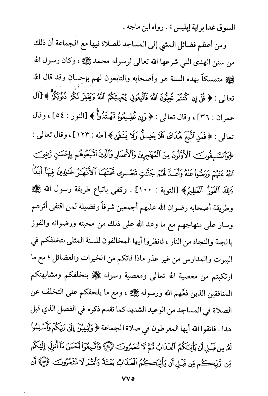 وكفى باتِّباع طريقة رسول الله - صلى الله عليه وسلم - وطريقة أصحابه -رضوان الله عليهم أجمعين- شرفًا وفضيلة لمن اقتفى أثرهم وسار على منهاجهم، مع ما وعد الله على ذلك من محبته ورضوانه والفوز بالجنة والنجاة من النار، فانظروا أيها المخالفون للسنة المثلى بتخلفكم في البيوت والمدارس من غير عذر، ماذا فاتكم من الخيرات والفضائل! مع ما ارتكبتم من معصية الله تعالى ومعصية رسوله - صلى الله عليه وسلم - بتخلفكم ومشابهتكم المنافقين الذين ذمهم الله ورسوله - صلى الله عليه وسلم -، ومع ما يلحقكم على التخلف عن الصلاة في المساجد من الوعيد الشديد كما تقدم ذكره في الفصل الذي قبل هذا.