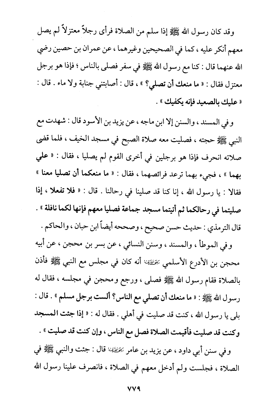 وقد كان رسول الله - صلى الله عليه وسلم - إذا سلم من الصلاة فرأى رجلاً معتزلاً لم يصل معهم أنكر عليه، كما في الصحيحين وغيرهما، عن عمران بن حصين -رضي الله عنهما- قال: كنا مع رسول الله - صلى الله عليه وسلم - في سفر فصلى بالناس، فإذا هو برجل معتزل فقال: «ما منعك أن تصلي؟» قال: أصابتني جنابة ولا ماء، قال: «عليك بالصعيد فإنه يكفيك».