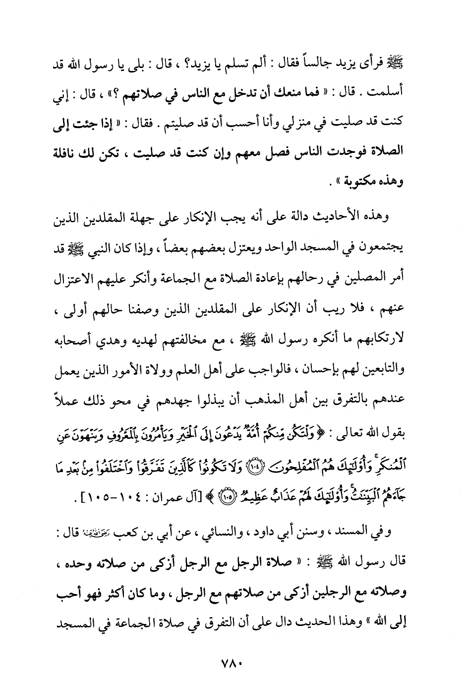 وفي المسند، وسنن أبي داود، والنسائي، عن أُبي بن كعب - رضي الله عنه - قال: قال رسول الله - صلى الله عليه وسلم -: «صلاة الرجل مع الرجل أزكى من صلاته وحده، وصلاته مع الرجلين أزكى من صلاتهم مع الرجل، وما كان أكثر فهو أحب إلى الله» وهذا الحديث دال على أن التفرق في صلاة الجماعة في المسجد