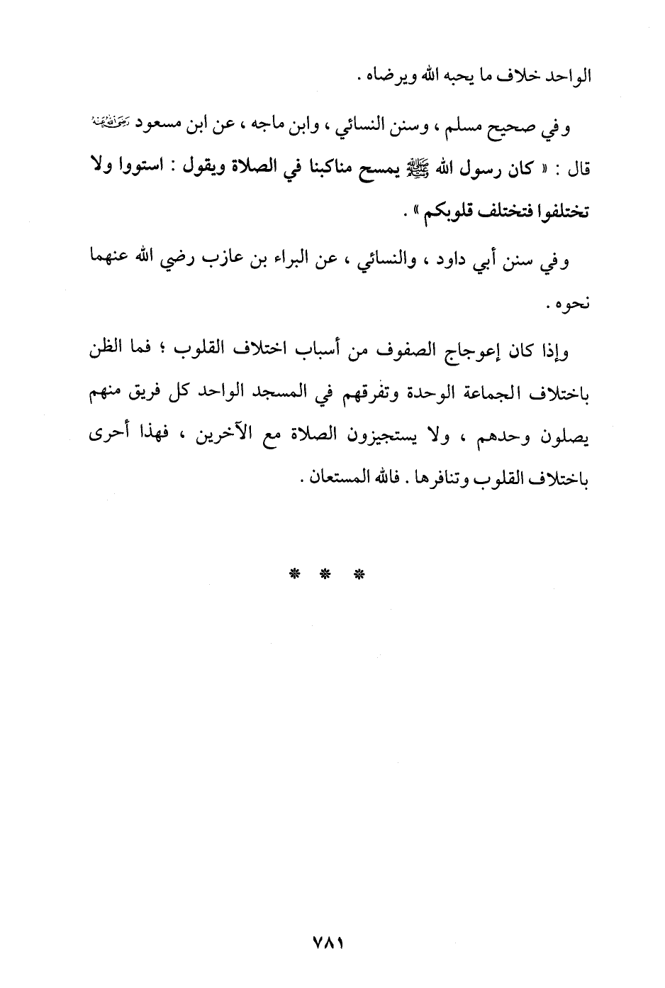 وفي صحيح مسلم، وسنن النسائي، وابن ماجة، عن ابن مسعود - رضي الله عنه - قال: كان رسول الله - صلى الله عليه وسلم - يمسح مناكبنا في الصلاة ويقول: «استووا ولا تختلفوا فتختلف قلوبكم».