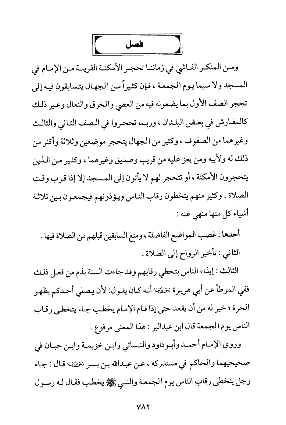 ومن المنكر الفاشي في زماننا تحجر الأمكنة القريبة من الإمام في المسجد ولا سيما يوم الجمعة، فإن كثيرًا من الجهال يتسابقون فيه إلى تحجر الصف الأول بما يضعونه فيه من العصي والخرق والنعال وغير ذلك كالمفارش في بعض البلدان، وربما تحجروا في الصف الثاني والثالث وغيرهما من الصفوف، وكثير من الجُهَّال يتحجر موضعين وثلاثة وأكثر من ذلك له ولأبيه ومن يعز عليه من قريب وصديق وغيرهما، وكثير من الذين يتحجرون الأمكنة أو تُتَحجر لهم لا يأتون إلى المسجد إلا إذا قرب وقت الصلاة، وكثير منهم يتخطون رقاب الناس ويؤذونهم فيجمعون بين ثلاثة أشياء كل منها منهي عنه: