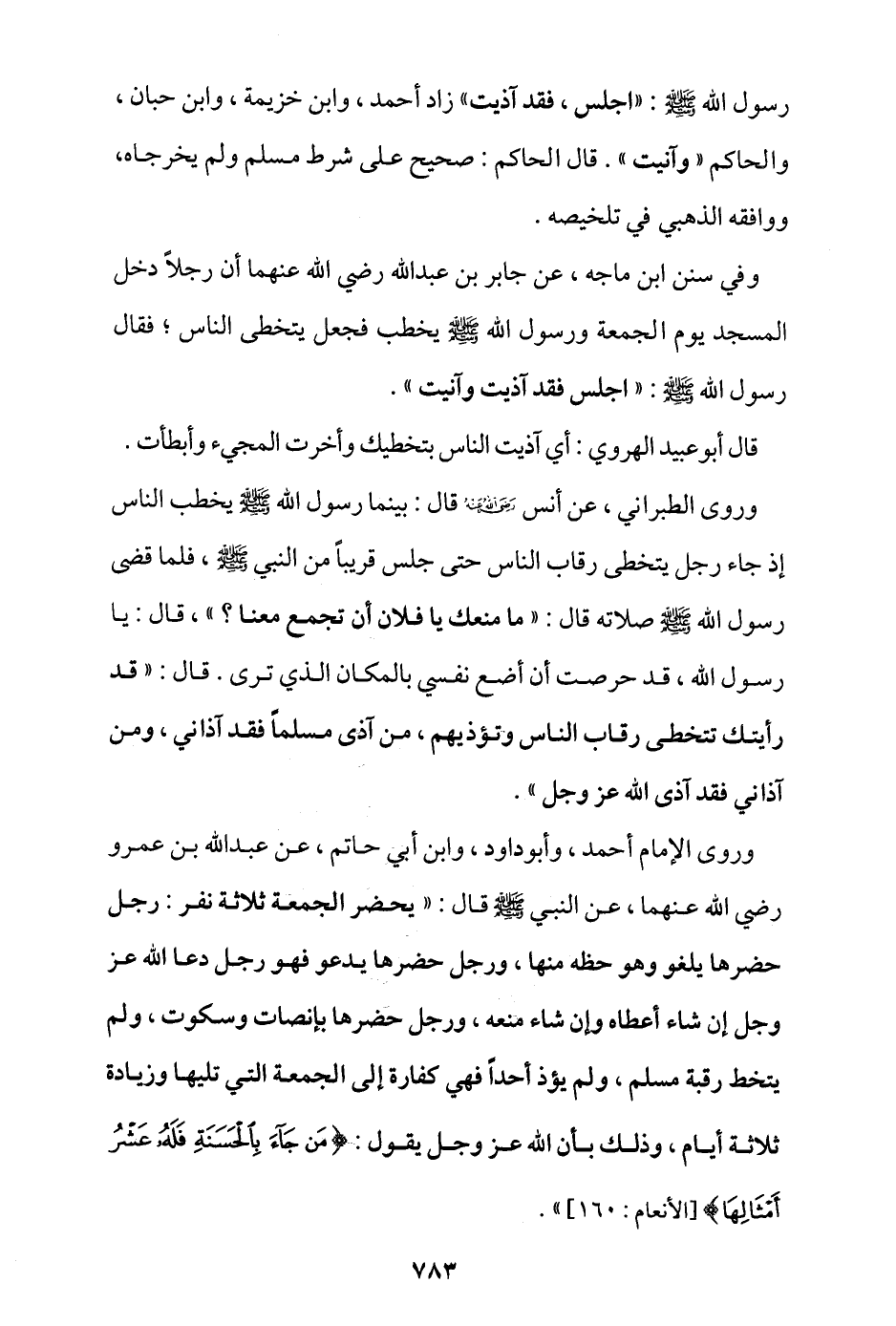 وفي سنن ابن ماجة، عن جابر بن عبد الله -رضي الله عنهما- أن رجلا دخل المسجد يوم الجمعة ورسول الله - صلى الله عليه وسلم - يخطب فجعل يتخطى الناس، فقال رسول الله - صلى الله عليه وسلم -: «اجلس، فقد آذيت وآنيت».