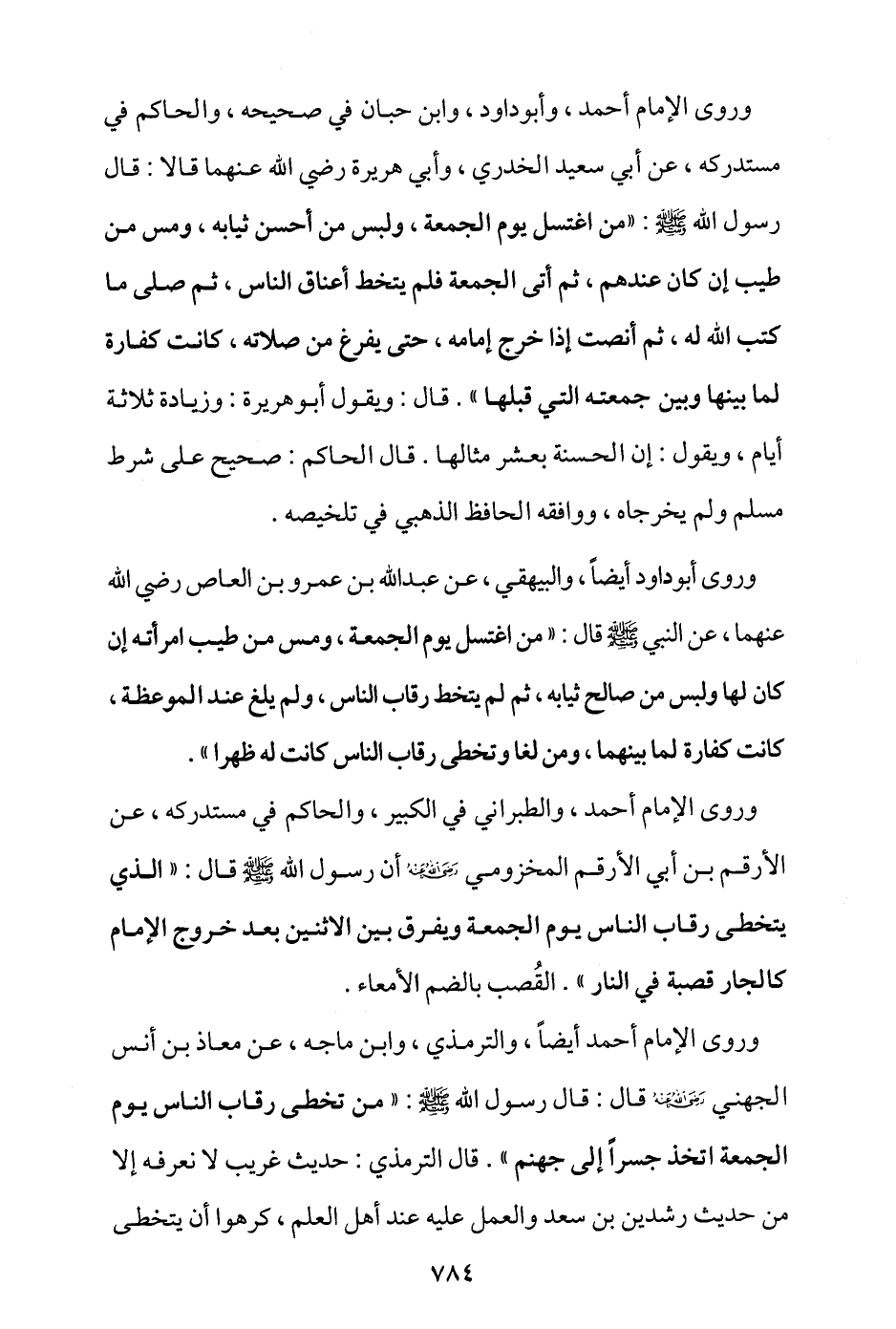 وروى الإمام أحمد، وأبو داود، وابن حبان في صحيحه، والحاكم في مستدركه، عن أبي سعيد الخدري وأبي هريرة -رضي الله عنهما- قالا: قال رسول الله - صلى الله عليه وسلم -: «من اغتسل يوم الجمعة، ولبس من أحسن ثيابه، ومسّ من طيب إن كان عندهم، ثم أتى الجمعة فلم يتخط أعناق الناس، ثم صلى ما كتب الله له، ثم أنصت إذا خرج إمامه، حتى يفرغ من صلاته، كانت كفارة لما بينها وبين جمعته التي قبلها» قال: ويقول أبو هريرة: وزيادة ثلاثة أيام، ويقول: إن الحسنة بعشر مثالها. قال الحاكم: صحيح على شرط مسلم ولم يخرجاه، ووافقه الحافظ الذهبي في تلخيصه.
