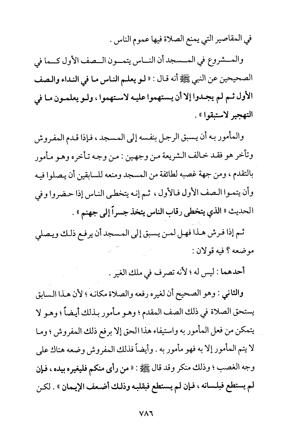 والثاني: وهو الصحيح أن لغيره رفعه والصلاة مكانه؛ لأن هذا السابق يستحق الصلاة في ذلك الصف المقدم، وهو مأمور بذلك أيضا، وهو لا يتمكن من فعل المأمور به واستيفاء هذا الحق إلا برفع ذلك المفروش، وما لا يتم المأمور إلا به فهو مأمور به، وأيضا فذلك المفروش وضعه هناك على وجه الغصب وذلك منكر، وقد قال - صلى الله عليه وسلم -: «من رأى منكم منكرًا فليغيره بيده، فإن لم يستطع فلسانه، فإن لم يستطع فبقلبه وذلك أضعف الإيمان»، لكن