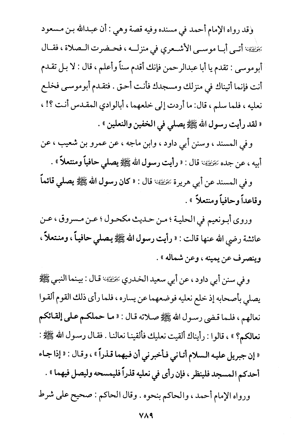 وروي أبو نعيم في الحلية، من حديث مكحول، عن مسروق، عن عائشة -رضي الله عنها- قالت: «رأيت رسول الله - صلى الله عليه وسلم - يصلي حافيًا، ومنتعلاً، وينصرف عن يمينه، وعن شماله».