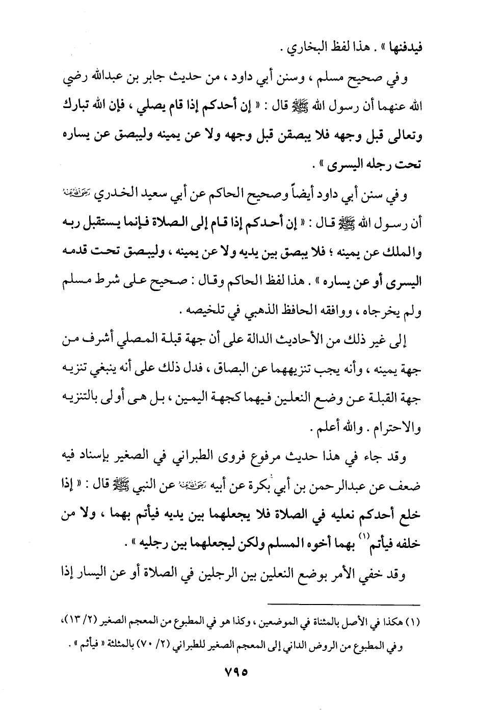 إلى غير ذلك من الأحاديث الدالة على أن جهة قبلة المصلي أشرف من جهة يمينه، وأنه يجب تنزيههما عن البصاق، فدل ذلك على أنه ينبغي تنزيه جهة القبلة عن وضع النعلين فيهما كجهة اليمين، بل هي أولى بالتنزيه والاحترام، والله أعلم.