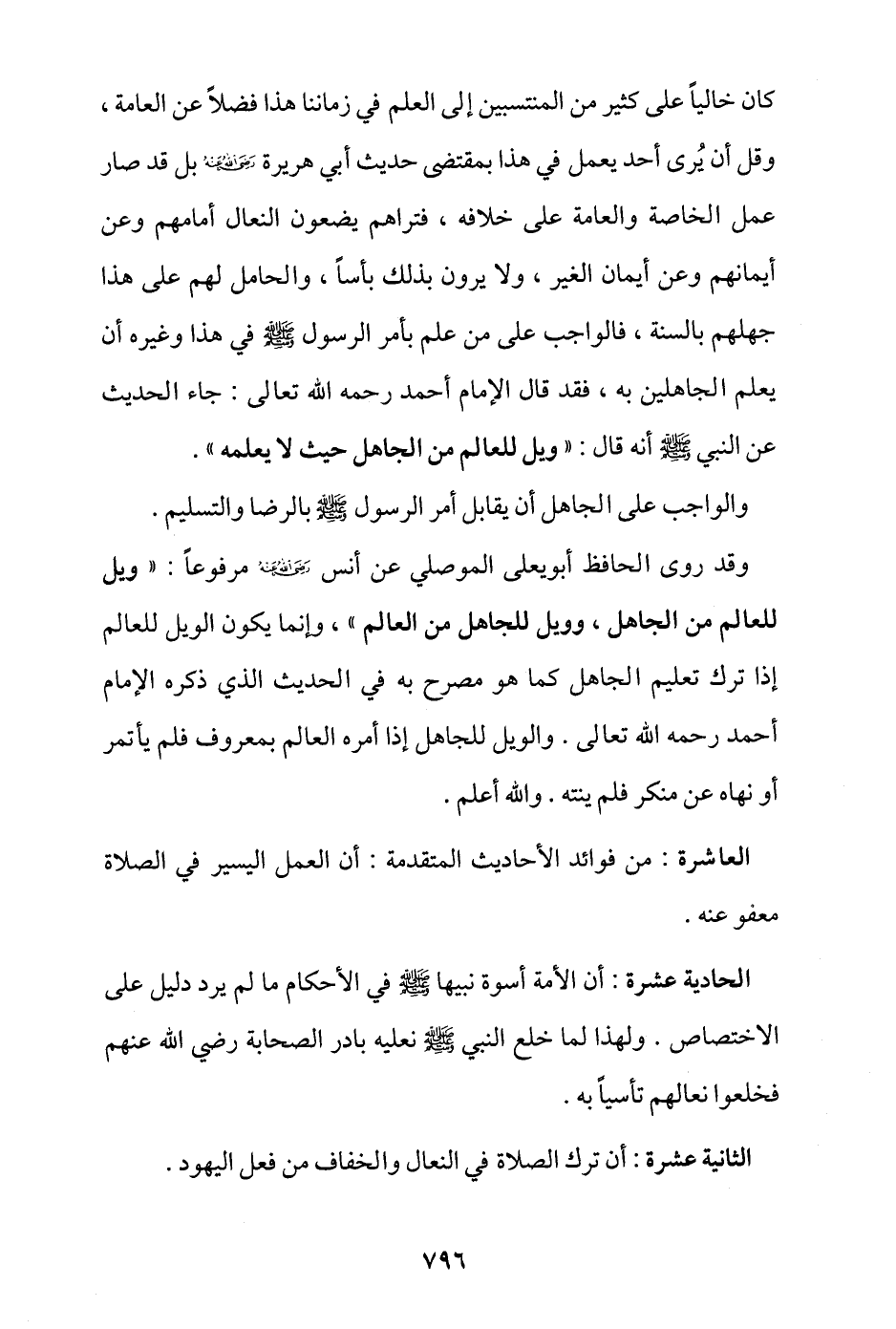 وقد روى الحافظ أبو يعلى الموصلي عن أنس - رضي الله عنه - مرفوعًا: «ويل للعالم من الجاهل، وويل للجاهل من العالم» وإنما يكون الويل للعالم إذا ترك تعليم الجاهل كما هو مصرح به في الحديث الذي ذكره الإمام أحمد رحمه الله تعالى، والويل للجاهل إذا أمره العالم بمعروف فلم يأتمر أو نهاه عن منكر فلم ينته، والله أعلم.