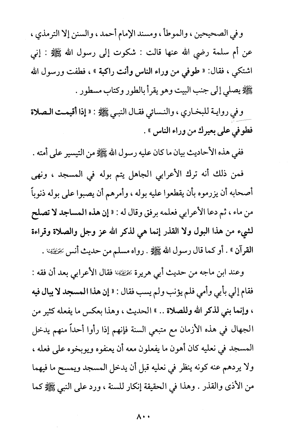وعند ابن ماجة من حديث أبي هريرة - رضي الله عنه - فقال الأعرابي بعد أن فقه: فقام إليَّ بأبي وأمي فلم يؤنب ولم يسب فقال: «إن هذا المسجد لا يبال فيه، وإنما بني لذكر الله وللصلاة ...» الحديث، وهذا بعكس ما يفعله كثير من الجهال في هذه الأزمان مع متبعي السنة، فإنهم إذا رأوا أحدًا منهم يدخل المسجد في نعليه كان أهون ما يفعلون معه أن يعنفوه ويوبخوه على فعله، ولا يردهم عنه كونه ينظر في نعليه قبل أن يدخل المسجد ويمسح ما فيهما من الأذى والقذر، وهذا في الحقيقة إنكار للسنة، ورد على النبي - صلى الله عليه وسلم - كما
