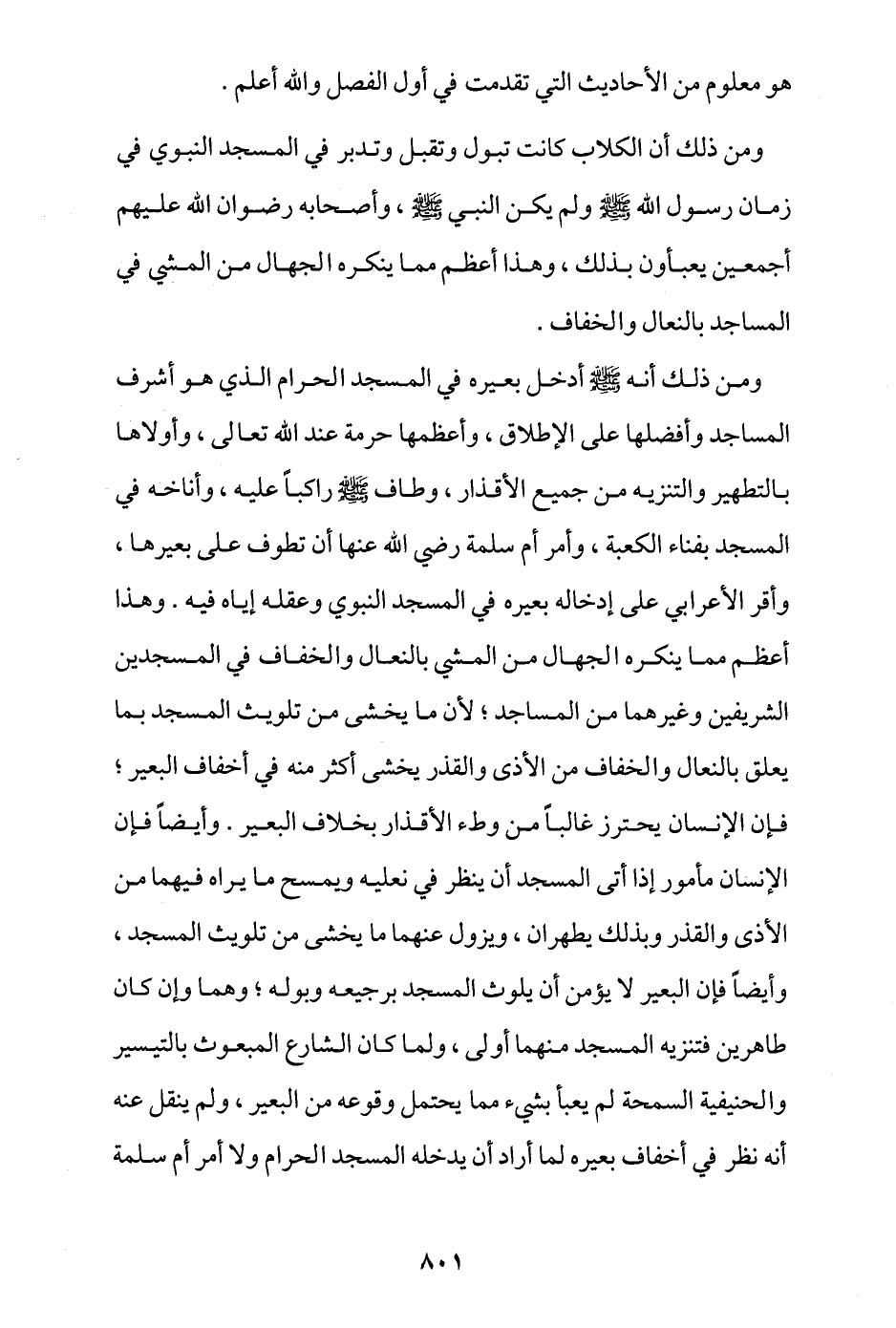 ومن ذلك أنه - صلى الله عليه وسلم - أدخل بعيره في المسجد الحرام الذي هو أشرف المساجد وأفضلها على الإطلاق، وأعظمها حرمة عند الله تعالى، وأولاها بالتطهير والتنزيه من جميع الأقذار، وطاف - صلى الله عليه وسلم - راكبًا عليه، وأناخه في المسجد بفناء الكعبة، وأمر أم سلمة -رضي الله عنها- أن تطوف على بعيرها، وأقرَّ الأعرابي على إدخاله بعيره في المسجد النبوي وعقله إياه فيه، وهذا أعظم مما ينكره الجهال من المشي بالنعال والخفاف في المسجدين الشريفين وغيرهما من المساجد؛ لأن ما يخشى من تلويث المسجد بما يعلق بالنعال والخفاف من الأذى والقذر يخشى أكثر منه في أخفاف البعير؛ فإن الإنسان يحترز غالبًا من وطء الأقذار بخلاف البعير، وأيضًا فإن الإنسان مأمور إذا أتى المسجد أن ينظر في نعليه ويمسح ما يراه فيهما من الأذى والقذر، وبذلك يطهران ويزول عنهما ما يخشى من تلويث المسجد، وأيضا فإن البعير لا يؤمن أن يلوث المسجد برجيعه وبوله، وهما وإن كانا طاهرين فتنزيه المسجد منهما أولى، ولما كان الشارع المبعوث بالتيسير والحنيفية السمحة لم يعبأ بشيء مما يحتمل وقوعه من البعير، ولم يُنقل عنه أنه نظر في أخفاف بعيره لما أراد أن يدخله المسجد الحرام، ولا أمر أم سلمة