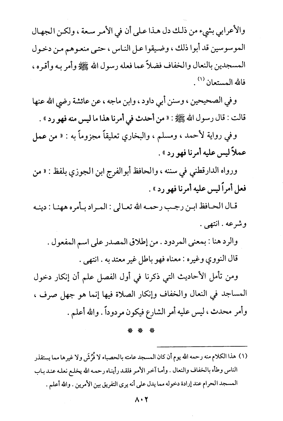 ومن تأمل الأحاديث التي ذكرنا في أول الفصل علم أن إنكار دخول المساجد في النعال والخفاف وإنكار الصلاة فيها إنما هو جهل صرف، وأمر محدث، ليس عليه أمر الشارع، فيكون مردودًا، والله أعلم.