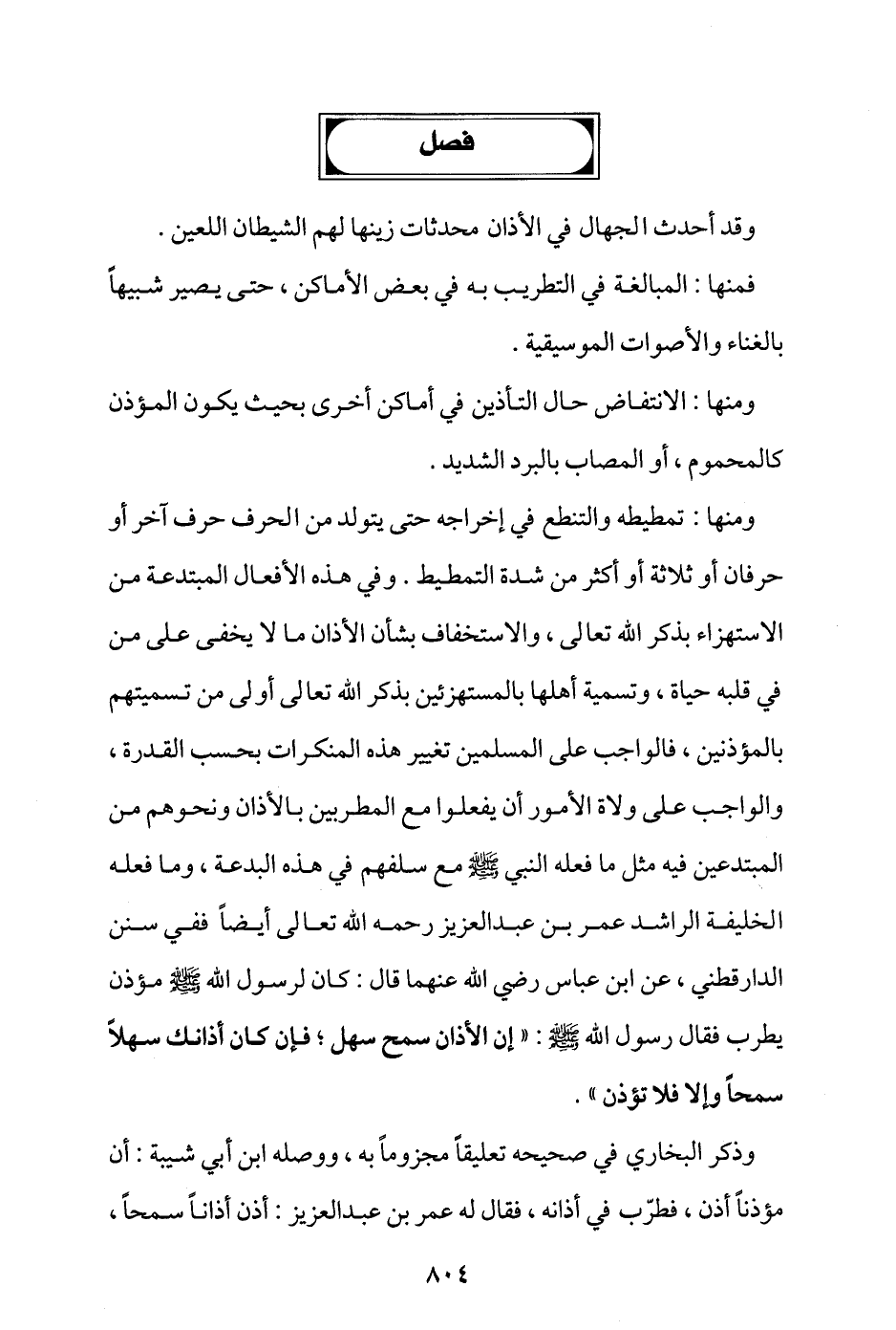 ومنها: تمطيطه والتنطع في إخراجه حتى يتولد من الحرف حرف آخر أو حرفان أو ثلاثة أو أكثر من شدة التمطيط، وفي هذه الأفعال المبتدعة من الاستهزاء بذكر الله تعالى، والاستخفاف بشأن الأذان ما لا يخفى على من في قلبه حياة، وتسمية أهلها بالمستهزئين بذكر الله تعالى أولى من تسميتهم بالمؤذنين، فالواجب على المسلمين تغيير هذه المنكرات بحسب القدرة، والواجب على ولاة الأمور أن يفعلوا مع المطربين بالأذان ونحوهم من المبتدعين فيه مثل ما فعله النبي - صلى الله عليه وسلم - مع سلفهم في هذه البدعة، وما فعله الخليفة الراشد عمر بن عبد العزيز رحمه الله تعالى أيضا؛ ففي سنن الدارقطني، عن ابن عباس -رضي الله عنهما- قال: كان لرسول الله - صلى الله عليه وسلم - مؤذن يطرب، فقال رسول الله - صلى الله عليه وسلم -: «إن الأذان سمح سهل؛ فإن كان أذانك سهلاً سمحًا وإلا فلا تؤذن».
