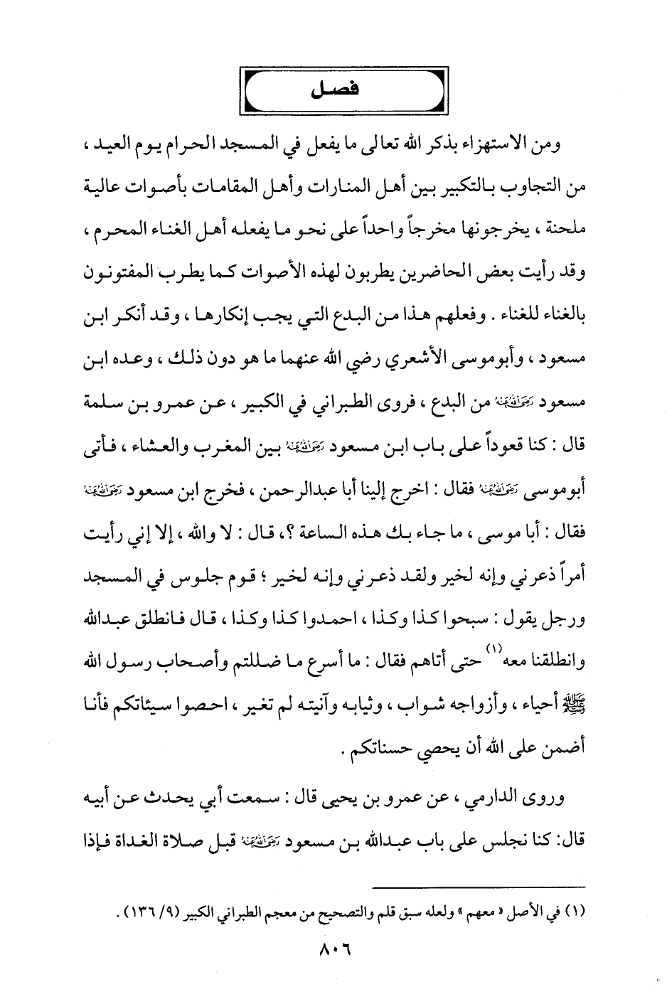 ومن الاستهزاء بذكر الله تعالى ما يفعل في المسجد الحرام يوم العيد، من التجاوب بالتكبير بين أهل المنارات وأهل المقامات بأصوات عالية ملحنة، يخرجونها مخرجًا واحدًا على نحو ما يفعله أهل الغناء المحرم، وقد رأيت بعض الحاضرين يطربون لهذه الأصوات كما يطرب المفتونون بالغناء للغناء، وفعلهم هذا من البدع التي يجب إنكارها، وقد أنكر ابن مسعود وأبو موسى الأشعري -رضي الله عنهما- ما هو دون ذلك، وعده ابن مسعود - رضي الله عنه - من البدع؛ فروى الطبراني في الكبير، عن عمرو بن سلمة قال: كنا قعودا على باب ابن مسعود - رضي الله عنه - بين المغرب والعشاء، فأتى أبو موسى - رضي الله عنه - فقال: اخرج إلينا أبا عبد الرحمن، فخرج ابن مسعود - رضي الله عنه - فقال: أبا موسى، ما جاء بك هذه الساعة؟ قال: لا والله، إلا إني رأيت أمرا ذعرني وإنه لخير ولقد ذعرني وإنه لخير؛ قوم جلوس في المسجد ورجل يقول: سبحوا كذا وكذا، احمدوا كذا وكذا، قال: فانطلق عبد الله وانطلقنا معه (¬1) حتى أتاهم فقال: ما أسرع ما ضللتم وأصحاب رسول الله - صلى الله عليه وسلم - أحياء، وأزواجه شواب، وثيابه وآنيته لم تغير، أحصوا سيئاتكم فأنا أضمن على الله أن يحصي حسناتكم.