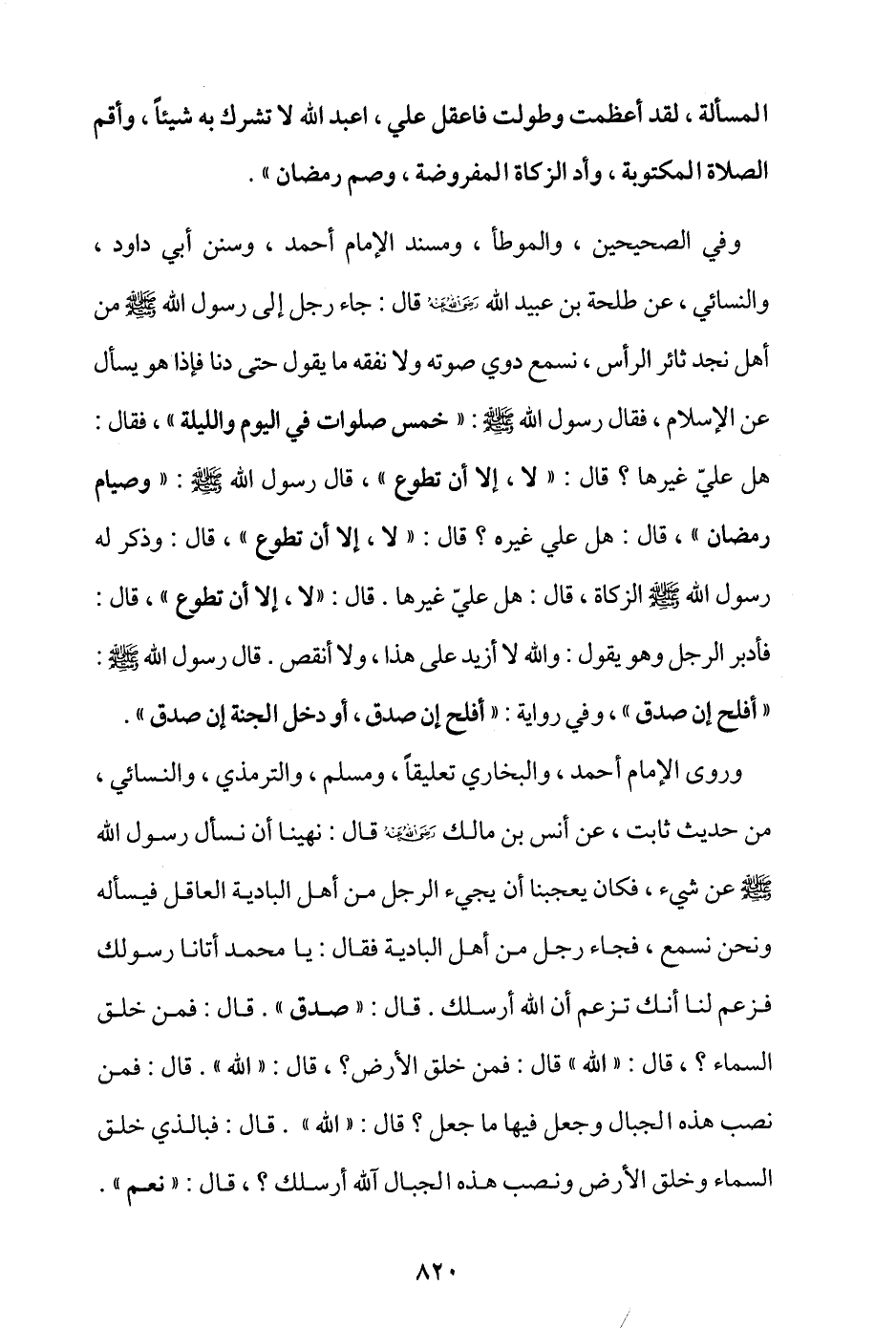 وفي الصحيحين، والموطأ، ومسند الإمام أحمد، وسنن أبي داود، والنسائي، عن طلحة بن عبيد الله - رضي الله عنه - قال: جاء رجل إلى رسول الله - صلى الله عليه وسلم - من أهل نجد ثائر الرأس، نسمع دوي صوته ولا نفقه ما يقول، حتى دنا فإذا هو يسأل عن الإسلام، فقال رسول الله - صلى الله عليه وسلم -: «خمس صلوات في اليوم والليلة» فقال: هل عليَّ غيرها؟ قال: «لا، إلا أن تطوع» قال رسول الله - صلى الله عليه وسلم -: «وصيام رمضان» قال: هل عليَّ غيره؟ قال: «لا، إلا أن تطوع» قال: فأدبر الرجل وهو يقول: والله لا أزيد على هذا ولا أنقص، قال رسول الله - صلى الله عليه وسلم -: «أفلح إن صدق»، وفي رواية: «أفلح إن صدق، أو دخل الجنة إن صدق».