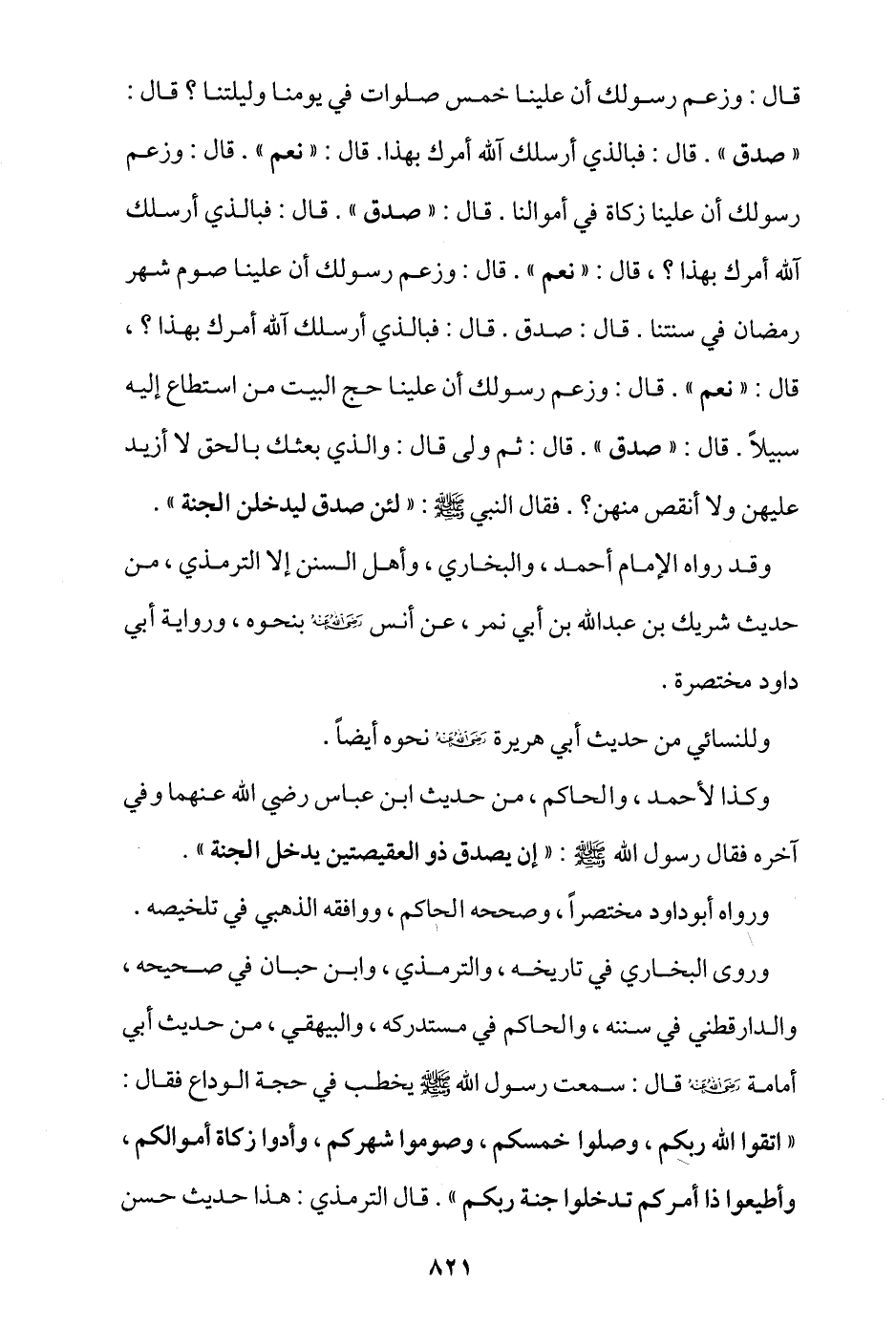 قال: وزعم رسولك أن علينا خمس صلوات في يومنا وليلتنا؟ قال: «صدق» قال: فبالذي أرسلك آلله أمرك بهذا؟ قال: «نعم» قال: وزعم رسولك أن علينا زكاة في أموالنا، قال: «صدق» قال: فبالذي أرسلك آلله أمرك بهذا؟ قال: «نعم» قال: وزعم رسولك أن علينا صوم شهر رمضان في سنتنا، قال: «صدق» قال: فبالذي أرسلك آلله أمرك بهذا؟ قال: «نعم» قال: وزعم رسولك أن علينا حج البيت من استطاع إليه سبيلاً، قال: «صدق» قال: ثم ولى، قال: والذي بعثك بالحق لا أزيد عليهن ولا أنقص منهن؟ فقال النبي - صلى الله عليه وسلم -: «لئن صدق ليدخلن الجنة».