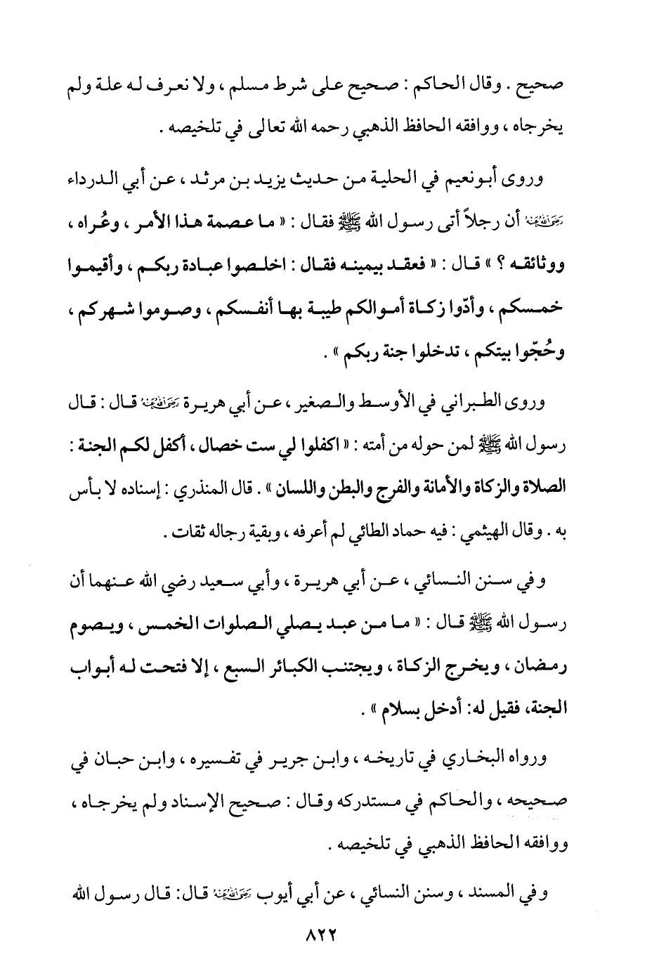 وروى الطبراني في الأوسط والصغير، عن أبي هريرة - رضي الله عنه - قال: قال رسول الله - صلى الله عليه وسلم - لمن حوله من أمته: «اكفلوا لي ست خصال أكفل لكم الجنة؛ الصلاة والزكاة والأمانة والفرج والبطن واللسان» قال المنذري: إسناده لا بأس به، وقال الهيثمي: فيه حماد الطائي لم أعرفه، وبقية رجاله ثقات.