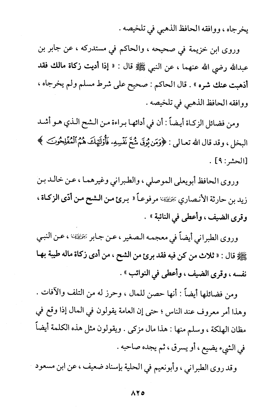وروى ابن خزيمة في صحيحه، والحاكم في مستدركه، عن جابر بن عبد الله -رضي الله عنهما- عن النبي - صلى الله عليه وسلم - قال: «إذا أديت زكاة مالك فقد أذهبت عنك شره» قال الحاكم: صحيح على شرط مسلم ولم يخرجاه، ووافقه الحافظ الذهبي في تلخيصه.
