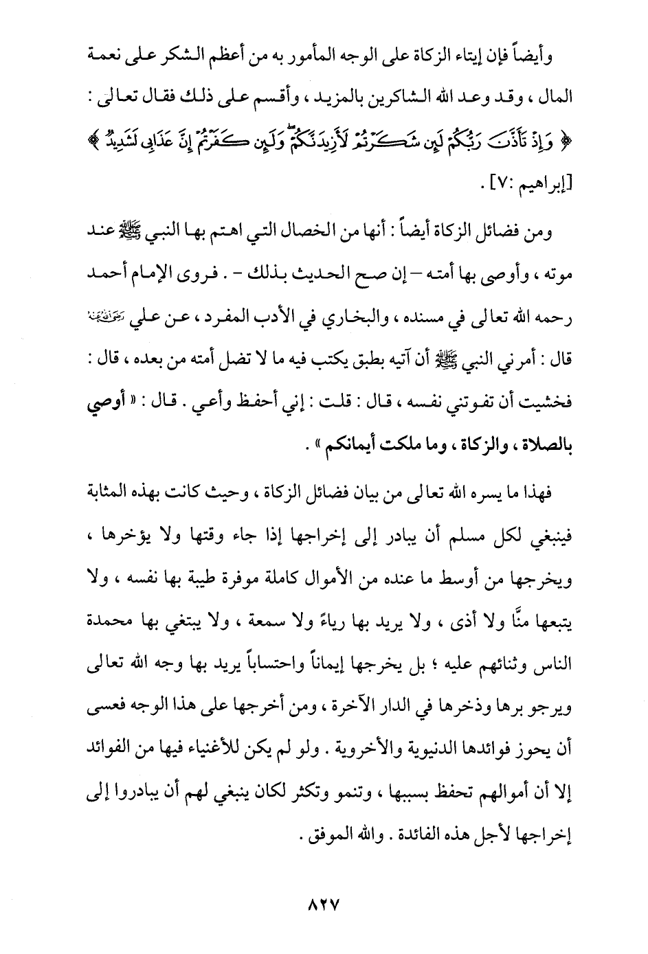 فهذا ما يسره الله تعالى من بيان فضائل الزكاة، وحيث كانت بهذه المثابة فينبغي لكل مسلم أن يبادر إلى إخراجها إذا جاء وقتها ولا يؤخرها، ويخرجها من أوسط ما عنده من الأموال كاملة موفرة طيبة بها نفسه، ولا يتبعها منا ولا أذى، ولا يريد بها رياء ولا سمعة، ولا يبتغي بها محمدة الناس وثنائهم عليه، بل يخرجها إيمانًا واحتسابًا يريد بها وجه الله تعالى ويرجو برها وذخرها في الدار الآخرة، ومن أخرجها على هذا الوجه فعسى أن يحوز فوائدها الدنيوية والأخروية، ولو لم يكن للأغنياء فيها من الفوائد إلا أن أموالهم تحفظ بسببها وتنمو وتكثر، لكان ينبغي لهم أن يبادروا إلى إخراجها لأجل هذه الفائدة، والله الموفق.