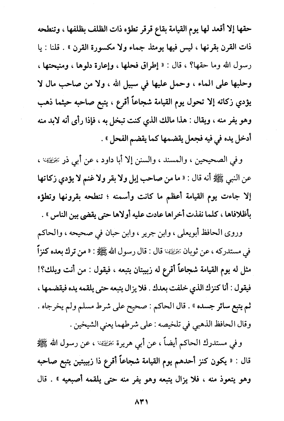 وفي مستدرك الحاكم أيضا، عن أبي هريرة - رضي الله عنه -، عن رسول الله - صلى الله عليه وسلم - قال: «يكون كنز أحدهم يوم القيامة شجاعًا أقرع ذا زبيبتين يتبع صاحبه وهو يتعوذ منه، فلا يزال يتبعه وهو يفر منه حتى يلقمه إصبعيه» قال