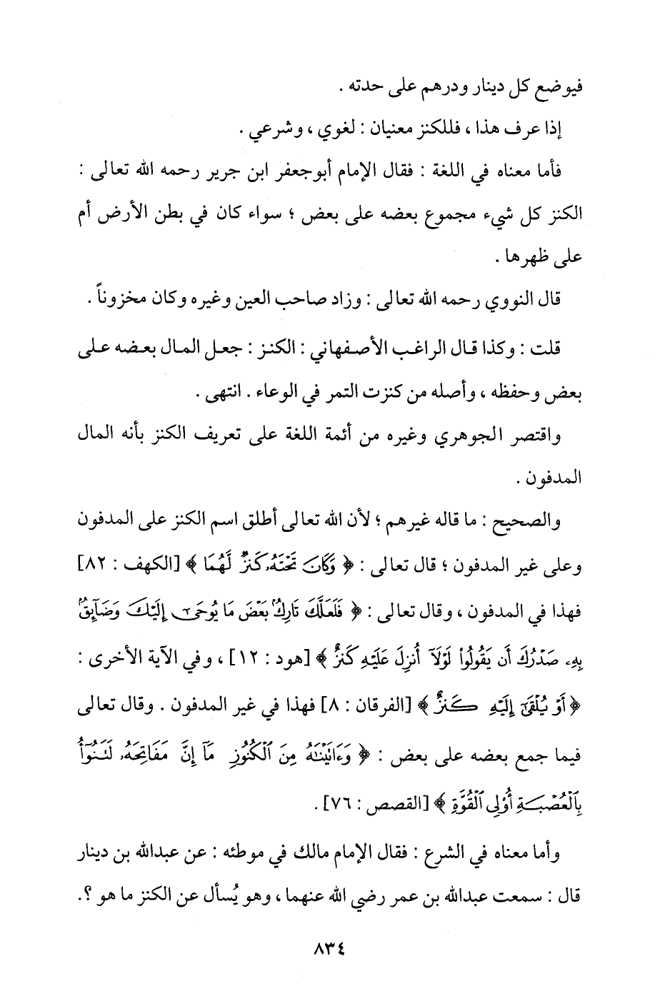 والصحيح ما قاله غيرهم؛ لأن الله تعالى أطلق اسم الكنز على المدفون وعلى غير المدفون؛ قال تعالى: {وَكَانَ تَحْتَهُ كَنْزٌ لَهُمَا} [الكهف: 82] فهذا في المدفون، وقال تعالى: {فَلَعَلَّكَ تَارِكٌ بَعْضَ مَا يُوحَى إِلَيْكَ وَضَائِقٌ بِهِ صَدْرُكَ أَنْ يَقُولُوا لَوْلَا أُنْزِلَ عَلَيْهِ كَنْزٌ} [هود: 12]، وفي الآية الأخرى: {أَوْ يُلْقَى إِلَيْهِ كَنْزٌ} [الفرقان: 8] فهذا في غير المدفون، وقال تعالى فيما جمع بعضه على بعض: {وَآَتَيْنَاهُ مِنَ الْكُنُوزِ مَا إِنَّ مَفَاتِحَهُ لَتَنُوءُ بِالْعُصْبَةِ أُولِي الْقُوَّةِ} [القصص: 76].