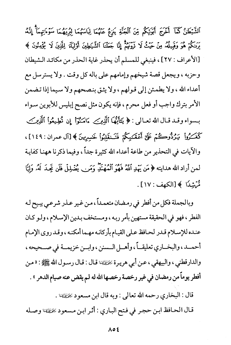 وبالجملة فكل من أفطر في رمضان متعمدًا من غير عذر شرعي يبيح له الفطر، فهو في الحقيقة مستهين بأمر ربه، ومستخف بدين الإسلام، ولو كان عنده للإسلام قدر لحافظ على القيام بأركانه مهما أمكنه، وقد روى الإمام أحمد، والبخاري تعليقًا، وأهل السنن، وابن خزيمة في صحيحه، والدارقطني، والبيهقي، عن أبي هريرة - رضي الله عنه - قال: قال رسول الله - صلى الله عليه وسلم -: «من أفطر يومًا من رمضان في غير رخصة رخصها الله له لم يقض عنه صيام الدهر».
