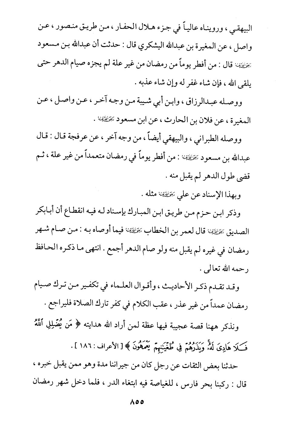 البيهقي، ورويناه عاليًا في جزء هلال الحفار، من طريق منصور، عن واصل، عن المغيرة بن عبد الله اليشكري قال: حدثت أن عبد الله بن مسعود - رضي الله عنه - قال: من أفطر يومًا من رمضان من غير علة لم يجزه صيام الدهر حتى يلقي الله، فإن شاء غفر له وإن شاء عذبه.
