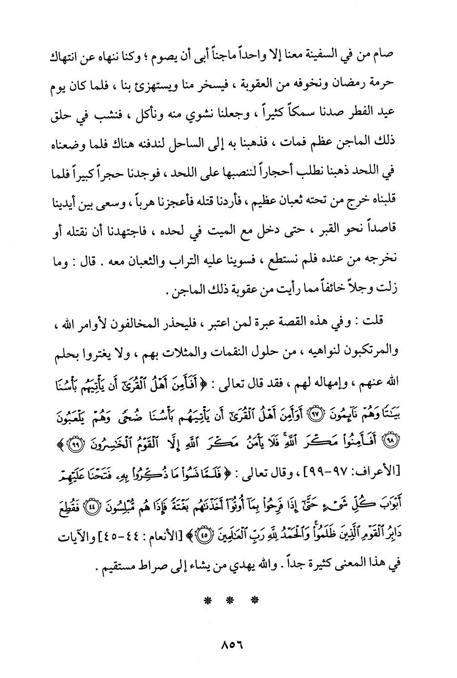 صام من في السفينة معنا إلا واحدًا ماجنا أبى أن يصوم؛ وكنا ننهاه عن انتهاك حرمة رمضان ونخوفه من العقوبة، فيسخر منا ويستهزئ بنا، فلما كان يوم عيد الفطر صدنا سمكًا كثيرًا، وجعلنا نشوي منه ونأكل، فنشب في حلق ذلك الماجن عظم فمات، فذهبنا به إلى الساحل لندفنه هناك، فلما وضعناه في اللحد ذهبنا نطلب أحجارًا لننصبها على اللحد، فوجدنا حجرًا كبيرًا، فلما قلبناه خرج من تحته ثعبان عظيم، فأردنا قتله فأعجزنا هربا، وسعى بين أيدينا قاصدًا نحو القبر حتى دخل مع الميت في لحده، فاجتهدنا أن نقتله أو نخرجه من عنده فلم نستطع، فسوينا عليه التراب والثعبان معه، قال: وما زلت وجلاً خائفا مما رأيت من عقوبة ذلك الماجن.
