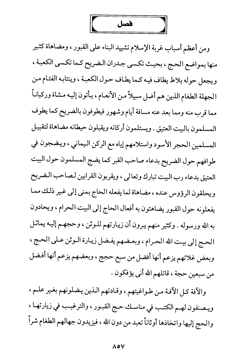 ومن أعظم أسباب غربة الإسلام تشييد البناء على القبور، ومضاهاة كثير منها بمواضع الحج، بحيث تكسى جدران الضريح كما تكسى الكعبة، ويجعل حوله بلاط يطاف فيه كما يطاف حول الكعبة، وينتابه الفئام من الجهلة الطغام الذين هم أضل سبيلاً من الأنعام، يأتون إليه مشاة وركبانا مما قرب منه ومما بعد عنه مسافة أيام وشهور، فيطوفون بالضريح كما يطوف المسلمون بالبيت العتيق، ويستلمون أركانه ويقبلون حيطانه مضاهاة لتقبيل المسلمين الحجر الأسود واستلامهم إياه مع الركن اليماني، ويضجون في طوافهم حول الضريح بدعاء صاحب القبر كما يضج المسلمون حول البيت العتيق بدعاء رب البيت تبارك وتعالى، ويقربون القرابين لصاحب الضريح ويحلقون الرؤوس عنده، مضاهاة لما يفعله الحاج بمنى، إلى غير ذلك مما يفعلونه حول القبور يضاهئون به أفعال الحاج إلى البيت الحرام، ويحادون به الله ورسوله، وكثير منهم يرون أن زيارتهم للوثن وحجهم إليه يماثل الحج إلى بيت الله الحرام، وبعضهم يفضل زيارة الوثن على الحج، وبعض غلاتهم يزعم أنها أفضل من سبع حجج، وبعضهم يزعم أنها أفضل من سبعين حجة، قاتلهم الله أنى يؤفكون.
