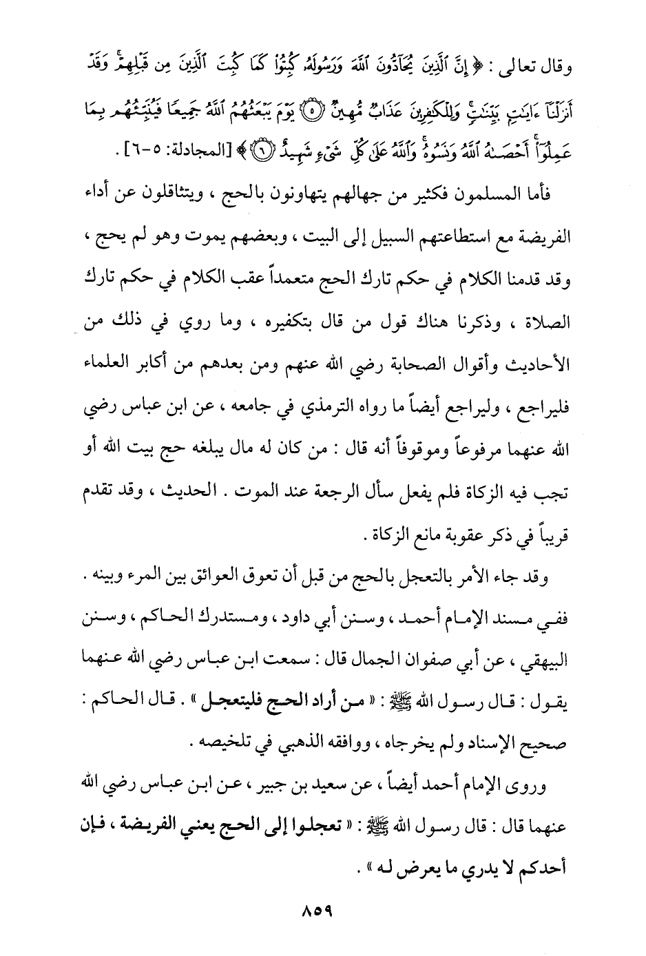 وروى الإمام أحمد أيضًا، عن سعيد بن جبير، عن ابن عباس -رضي الله عنهما- قال: قال رسول الله - صلى الله عليه وسلم -: «تعجلوا إلى الحج -يعني الفريضة- فإن أحدكم لا يدري ما يعرض له».