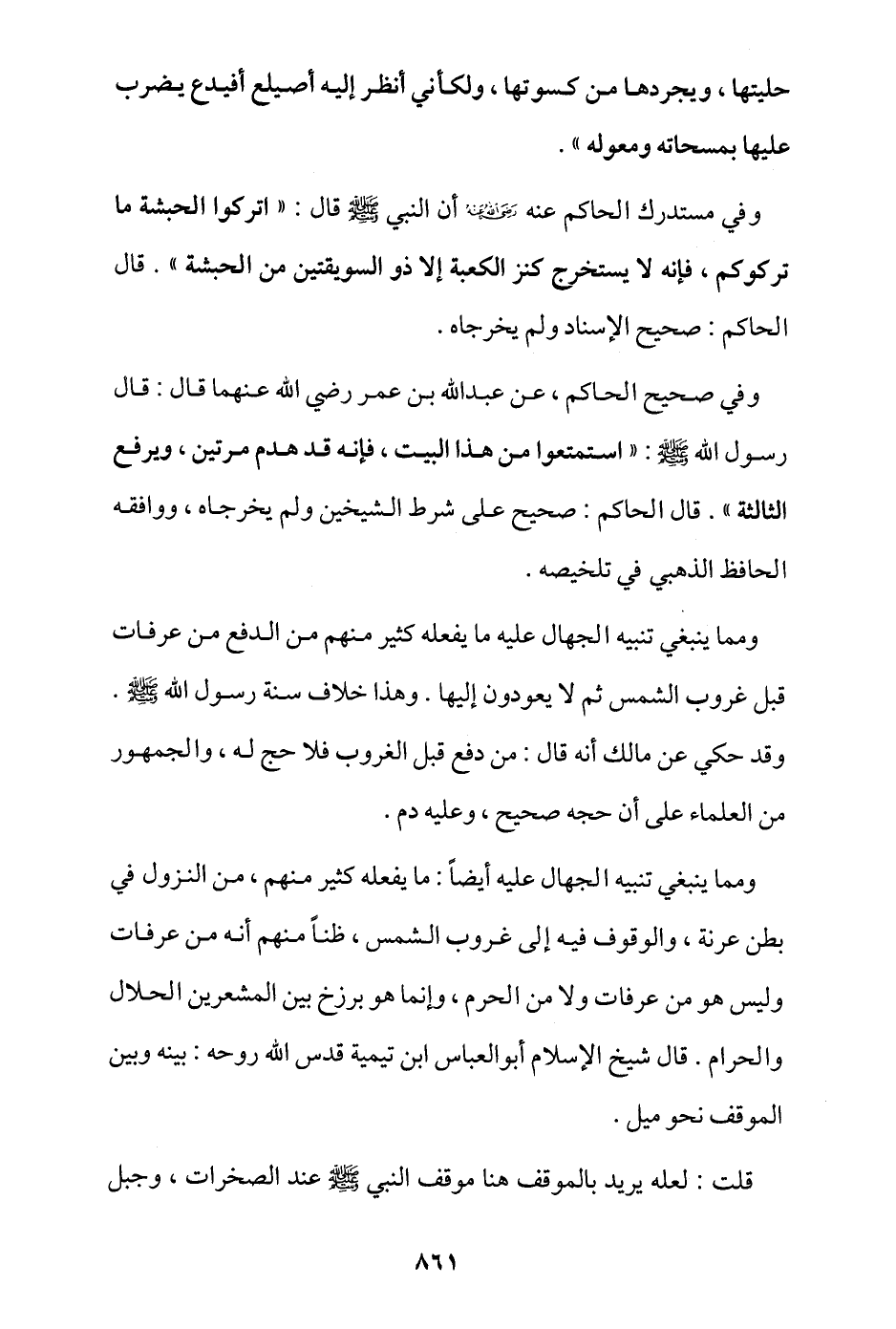 ومما ينبغي تنبيه الجهال عليه أيضا: ما يفعله كثير منهم، من النزول في بطن عرنة، والوقوف فيه إلى غروب الشمس، ظنًا منهم أنه من عرفات وليس هو من عرفات ولا من الحرم، وإنما هو برزخ بين المشعرين الحلال والحرام، قال شيخ الإسلام أبو العباس ابن تيمية قدس الله روحه: بينه وبين الموقف نحو ميل.