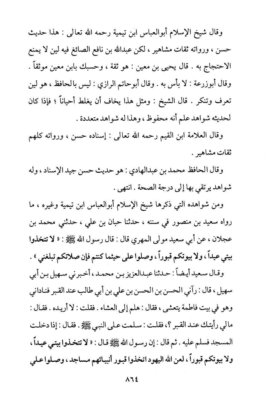 ومن شواهده التي ذكرها شيخ الإسلام أبو العباس ابن تيمية وغيره، ما رواه سعيد بن منصور في سننه، حدثنا حبان بن علي، حدثني محمد بن عجلان، عن أبي سعيد مولى المهري قال: قال رسول الله - صلى الله عليه وسلم -: «لا تتخذوا بيتي عيدًا، ولا بيوتكم قبورًا، وصلوا عليَّ حيثما كنتم فإن صلاتكم تبلغني».