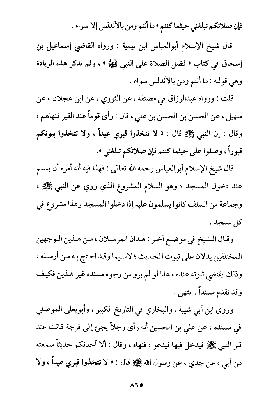 قلت: ورواه عبد الرزاق في مصنفه، عن الثوري، عن ابن عجلان، عن سهيل، عن الحسن بن الحسن بن علي، قال: رأى قومًا عند القبر فنهاهم، وقال: إن النبي - صلى الله عليه وسلم - قال: «لا تتخذوا قبري عيدًا، ولا تتخذوا بيوتكم قبورًا، وصلوا عليَّ حيثما كنتم فإن صلاتكم تبلغني».