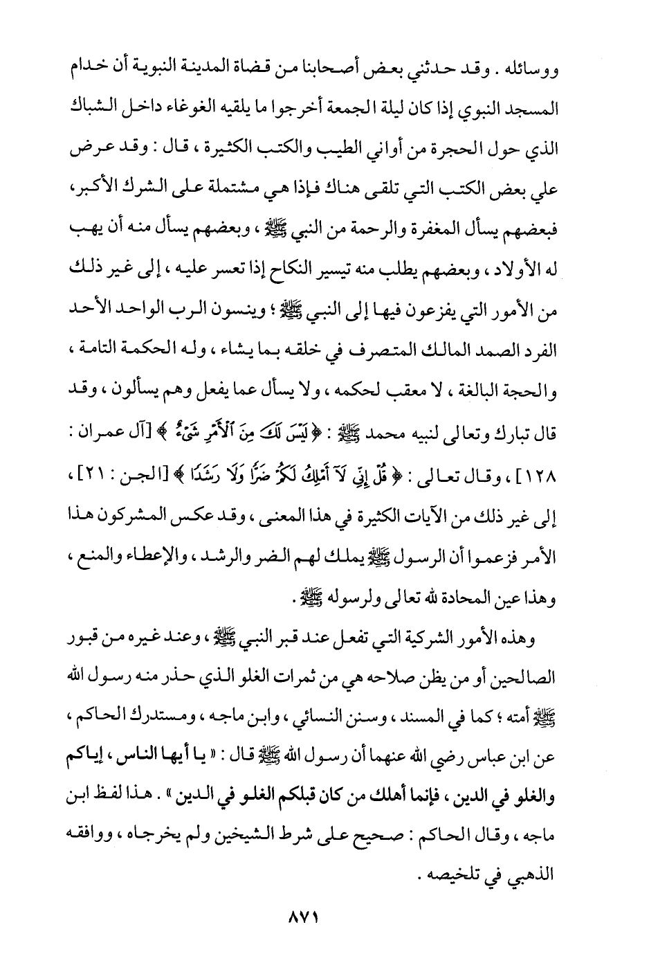 وهذه الأمور الشركية التي تفعل عند قبر النبي - صلى الله عليه وسلم -، وعند غيره من قبور الصالحين أو من يظن صلاحه، هي من ثمرات الغلو الذي حذر منه رسول الله - صلى الله عليه وسلم - أمته؛ كما في المسند، وسنن النسائي، وابن ماجة، ومستدرك الحاكم، عن ابن عباس -رضي الله عنهما- أن رسول الله - صلى الله عليه وسلم - قال: «يا أيها الناس، إياكم والغلو في الدين، فإنما أهلك من كان قبلكم الغلو في الدين» هذا لفظ ابن ماجة، وقال الحاكم: صحيح على شرط الشيخين ولم يخرجاه، ووافقه الذهبي في تلخيصه.